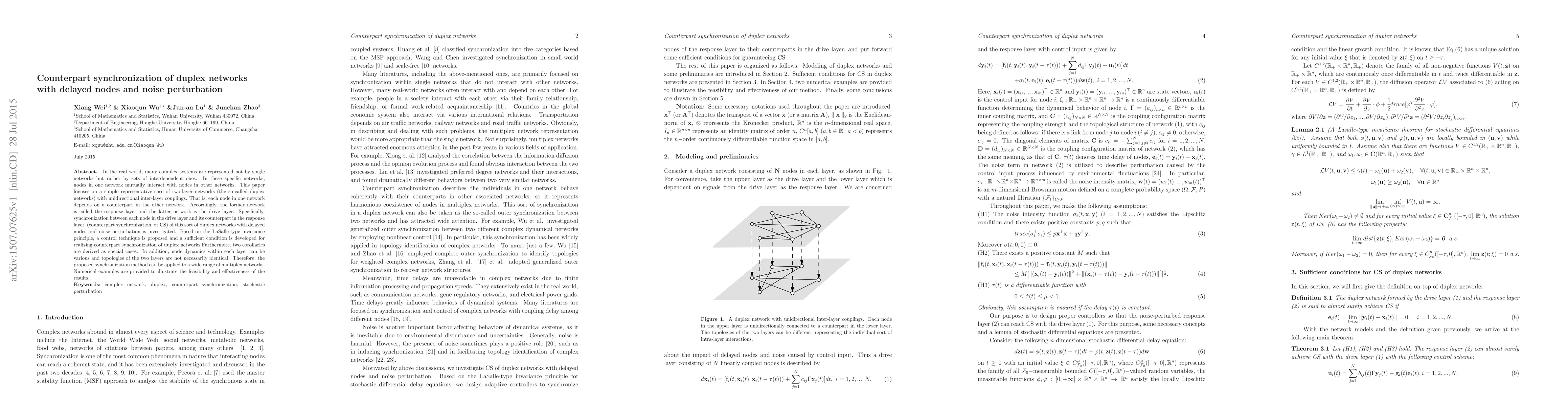 This paper investigates counterpart synchronization in duplex networks with delayed nodes and noise perturbation, proposing a control technique for achieving synchronized coupling between two interdependent networks.