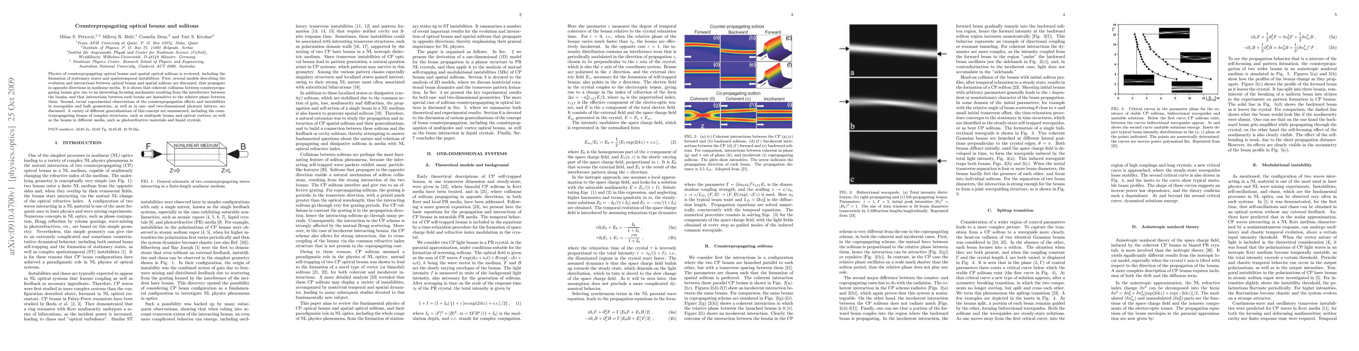 This paper reviews the physics of counterpropagating optical beams and spatial solitons, focusing on their interactions and formation of stationary states. It discusses models for beam evolution and highlights experimental observations of spatiotemporal instabilities in various geometries and media.