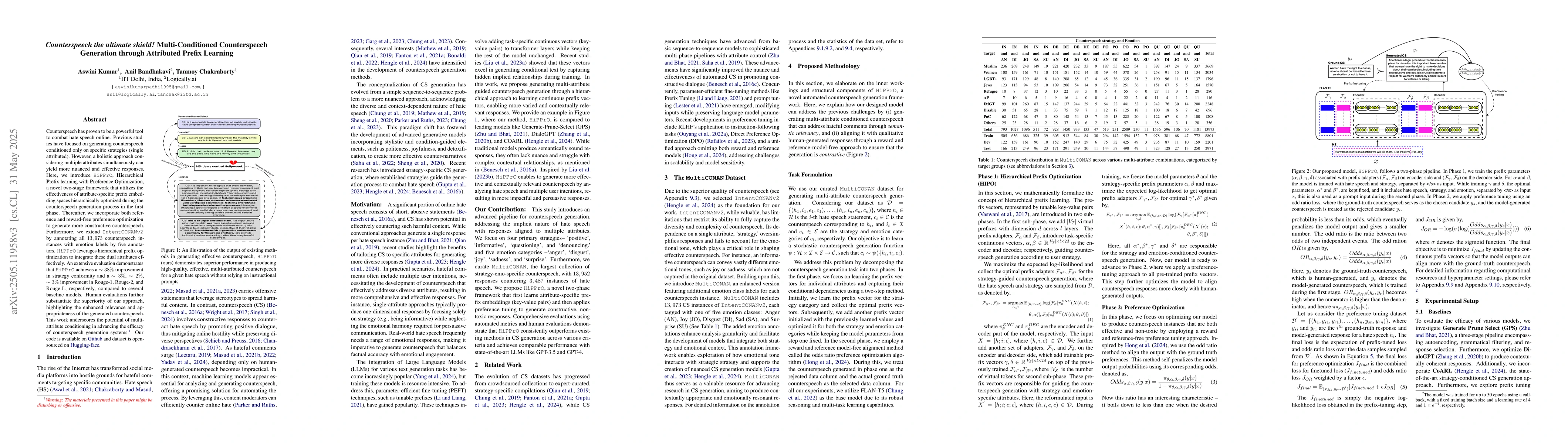 The hierarchical prefix learning with preference optimization approach for multi-attribute counterspeech generation, extending IntentCONANv2 with emotion-labeled instances, sets this work apart from previous single-attribute studies.