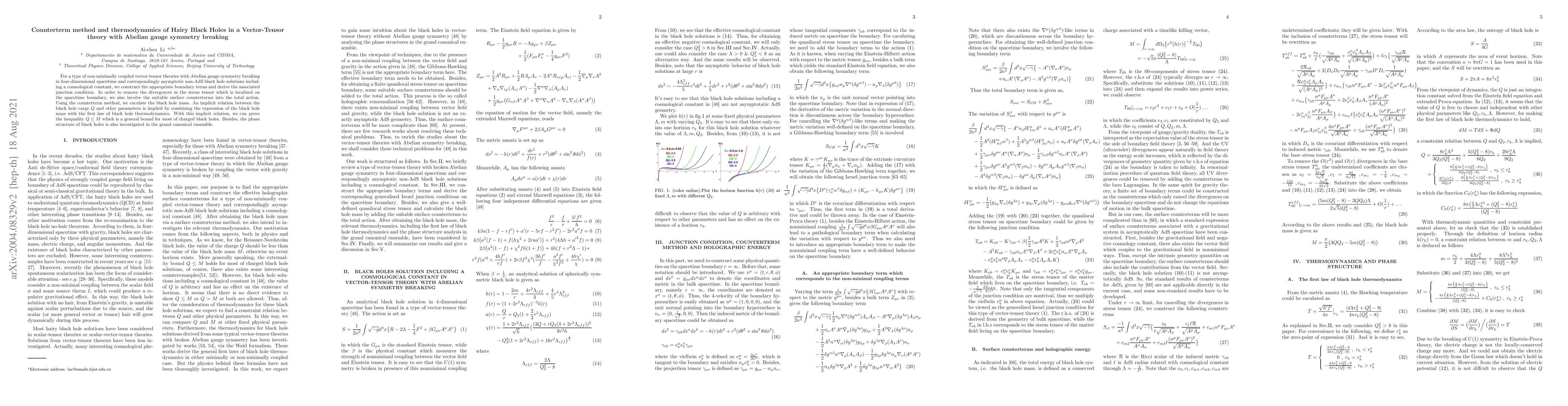 For a type of non-minimally coupled vector-tensor theories with Abelian gauge symmetry breaking in four-dimensional spacetime and correspondingly asymptotic non-AdS black hole solutions including a cosmological constant, we construct the appropriate boundary terms and derive the associated junction condition. In order to remove the divergences in the stress tensor which is localized on the spacetime boundary, we also involve the suitable surface counterterms into the total action. Using the counterterm method, we caculate the black hole mass. An implicit relation between the black hole carge $Q$ and other parameters is implied by combining the expression of the black hole mass with the first law of black hole thermodynamics. With this implicit relation, we can prove the inequality $Q\leq M$ which is a general bound for most of charged black holes. Besides, the phase structure of black holes is also investigated in the grand canonical ensemble.