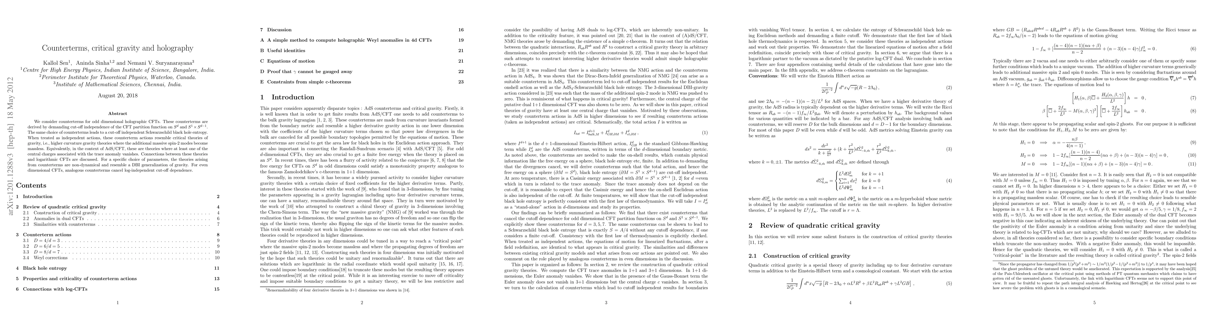 We consider counterterms for odd dimensional holographic CFTs. These counterterms are derived by demanding cut-off independence of the CFT partition function on $S^d$ and $S^1 \times S^{d-1}$. The same choice of counterterms leads to a cut-off independent Schwarzschild black hole entropy. When treated as independent actions, these counterterm actions resemble critical theories of gravity, i.e., higher curvature gravity theories where the additional massive spin-2 modes become massless. Equivalently, in the context of AdS/CFT, these are theories where at least one of the central charges associated with the trace anomaly vanishes. Connections between these theories and logarithmic CFTs are discussed. For a specific choice of parameters, the theories arising from counterterms are non-dynamical and resemble a DBI generalization of gravity. For even dimensional CFTs, analogous counterterms cancel log-independent cut-off dependence.