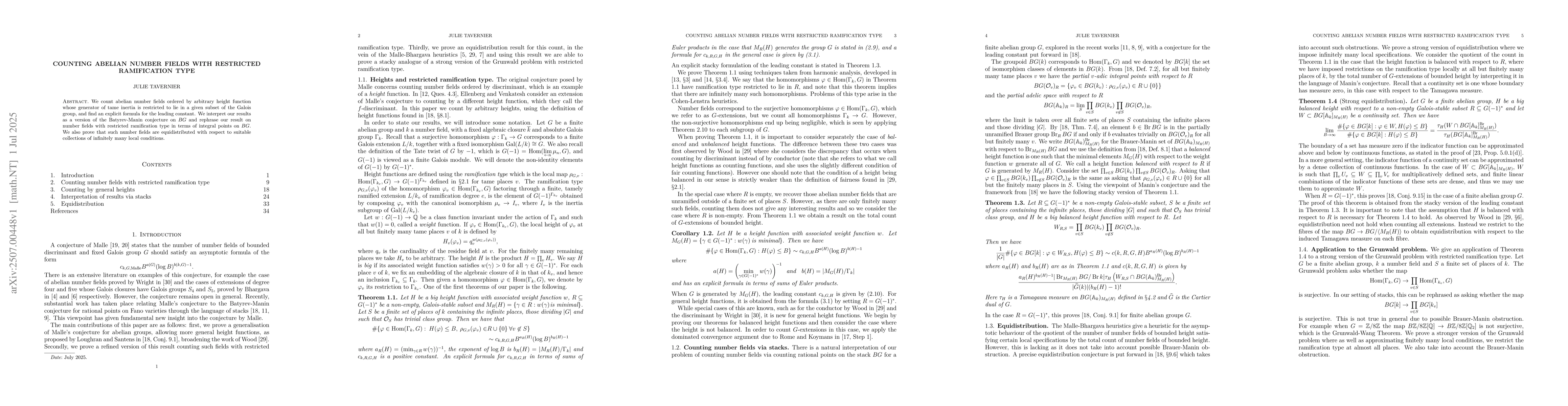 We count abelian number fields ordered by arbitrary height function whose generator of tame inertia is restricted to lie in a given subset of the Galois group, and find an explicit formula for the leading constant. We interpret our results as a version of the Batyrev-Manin conjecture on $BG$ and rephrase our result on number fields with restricted ramification type in terms of integral points on $BG$. We also prove that such number fields are equidistributed with respect to suitable collections of infinitely many local conditions.