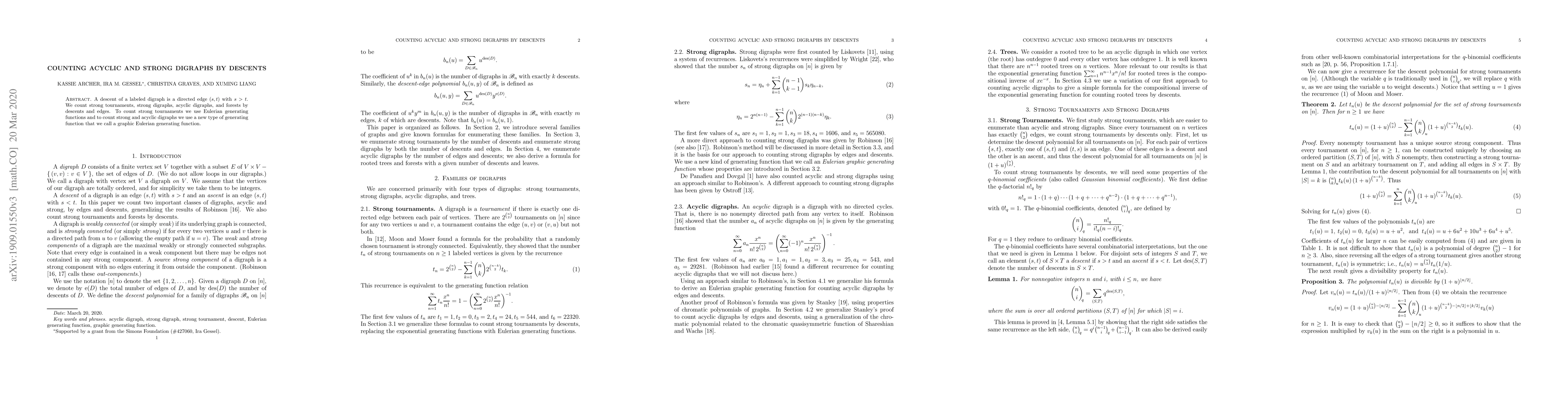This paper counts strong tournaments, strong digraphs, and acyclic digraphs using descents and edges, employing Eulerian generating functions for strong tournaments and a novel graphic Eulerian generating function for the other two types.