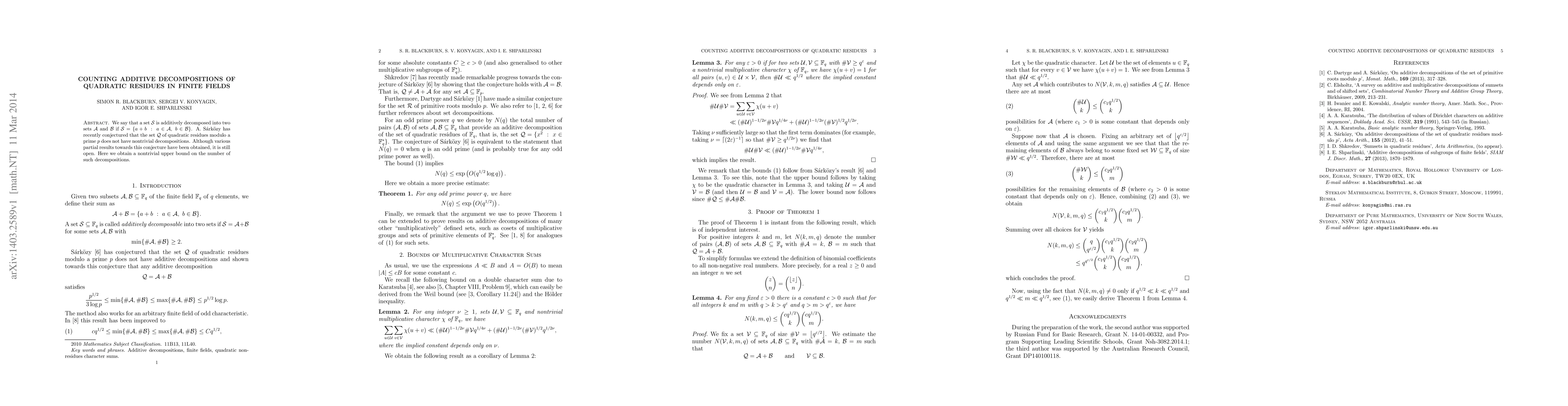 Researchers found a nontrivial upper bound on the number of additive decompositions of quadratic residues in finite fields, contributing to the ongoing study of Sárkřzy's conjecture about the set of quadratic residues.