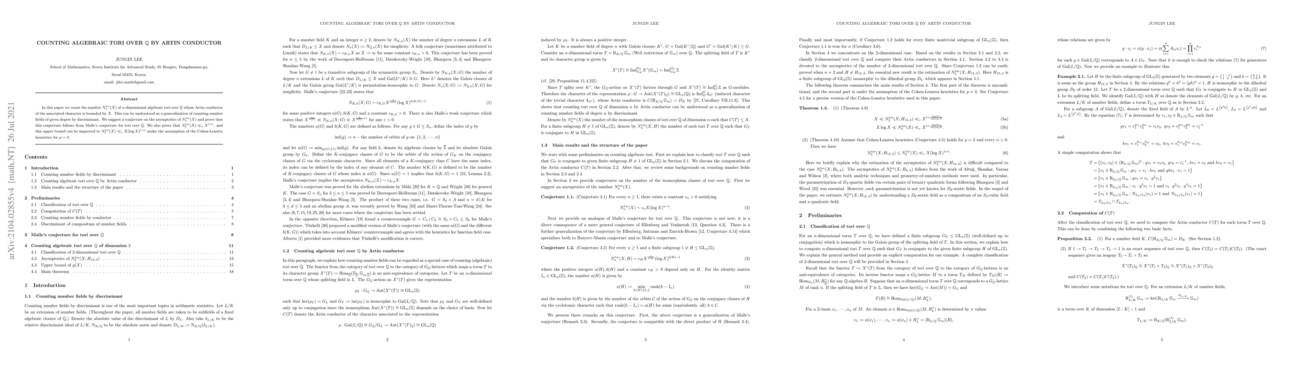 In this paper we count the number $N_n^{\text{tor}}(X)$ of $n$-dimensional algebraic tori over $\mathbb{Q}$ whose Artin conductor of the associated character is bounded by $X$. This can be understood as a generalization of counting number fields of given degree by discriminant. We suggest a conjecture on the asymptotics of $N_n^{\text{tor}}(X)$ and prove that this conjecture follows from Malle's conjecture for tori over $\mathbb{Q}$. We also prove that $N_2^{\text{tor}}(X) \ll_{\varepsilon} X^{1 + \varepsilon}$, and this upper bound can be improved to $N_2^{\text{tor}}(X) \ll_{\varepsilon} X (\log X)^{1 + \varepsilon}$ under the assumption of the Cohen-Lenstra heuristics for $p=3$.