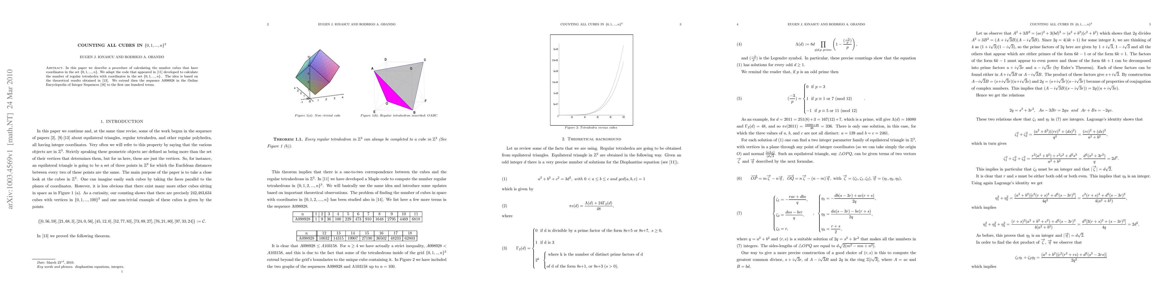 In this paper we describe a procedure of calculating the number cubes that have coordinates in the set {0,1,...,n}. We adapt the code that appeared in [11] developed to calculate the number of regular tetrahedra with coordinates in the set {0,1,...,n}. The idea is based on the theoretical results obtained in [13]. We extend then the sequence A098928 in the Online Encyclopedia of Integer Sequences to the first one hundred terms.