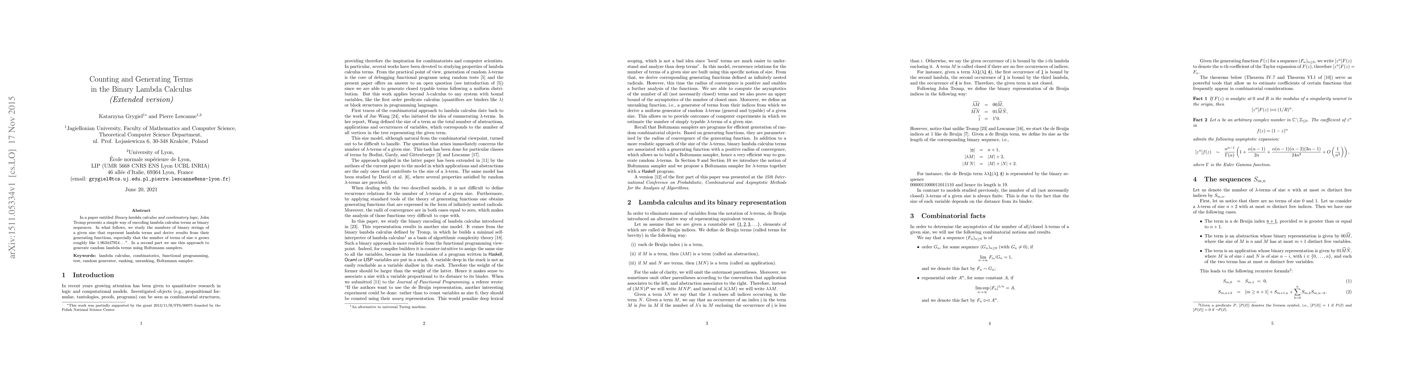 This paper explores the enumeration of lambda calculus terms encoded as binary sequences, finding that the number of terms of size n grows approximately as 1.963447954n. It also introduces a method for generating random lambda terms using Boltzmann samplers.