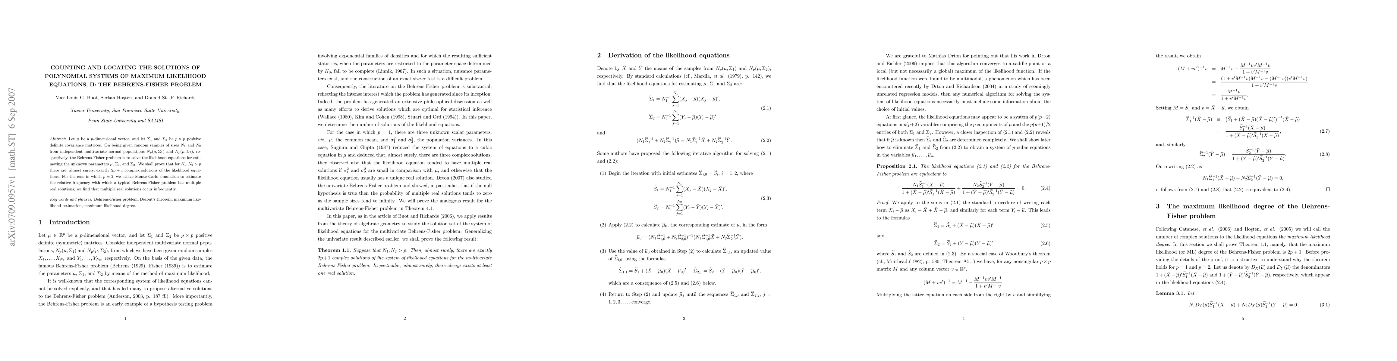 Let $\mu$ be a $p$-dimensional vector, and let $\Sigma_1$ and $\Sigma_2$ be $p \times p$ positive definite covariance matrices. On being given random samples of sizes $N_1$ and $N_2$ from independent multivariate normal populations $N_p(\mu,\Sigma_1)$ and $N_p(\mu,\Sigma_2)$, respectively, the Behrens-Fisher problem is to solve the likelihood equations for estimating the unknown parameters $\mu$, $\Sigma_1$, and $\Sigma_2$. We shall prove that for $N_1, N_2 > p$ there are, almost surely, exactly $2p+1$ complex solutions of the likelihood equations. For the case in which $p = 2$, we utilize Monte Carlo simulation to estimate the relative frequency with which a typical Behrens-Fisher problem has multiple real solutions; we find that multiple real solutions occur infrequently.