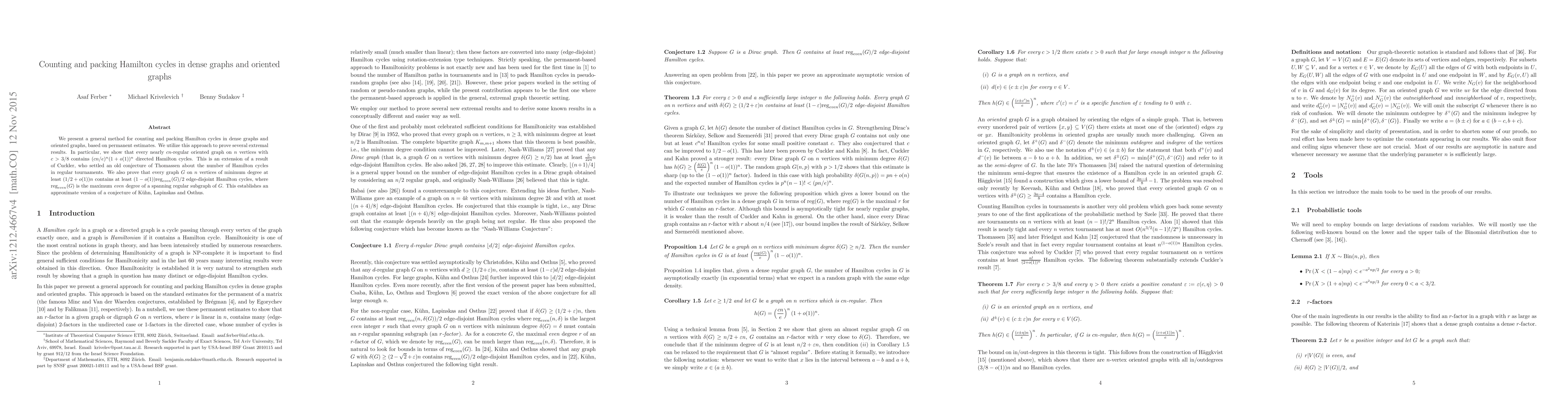 This paper introduces a method for counting and packing Hamilton cycles in dense graphs and oriented graphs using permanent estimates, proving that nearly $cn$-regular oriented graphs with $c>3/8$ contain $(cn/e)^n(1+o(1))^n$ directed Hamilton cycles. It also establishes that graphs with minimum degree at least $(1/2+\varepsilon)n$ contain at least $(1-\varepsilon)\textrm{reg}_{even}(G)/2$ edge-disjoint Hamilton cycles.