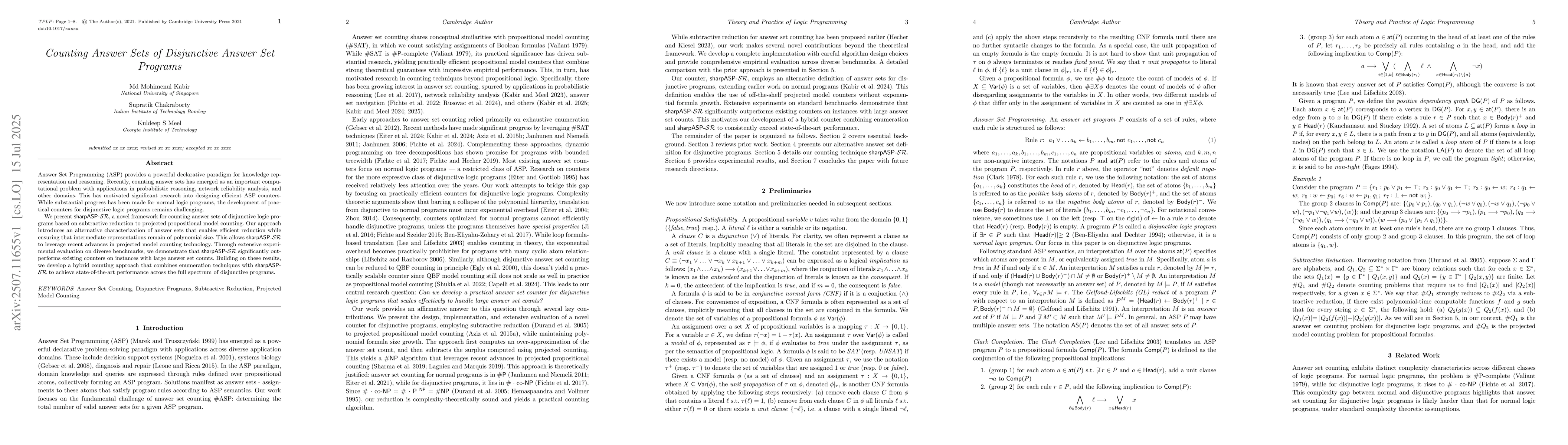 The research introduces SharpASP-SR, a new framework for efficiently counting answer sets in disjunctive logic programs using subtractive reduction. It outperforms existing counters, especially for instances with large answer set counts, and combines with enumeration techniques for state-of-the-art performance across various disjunctive programs.