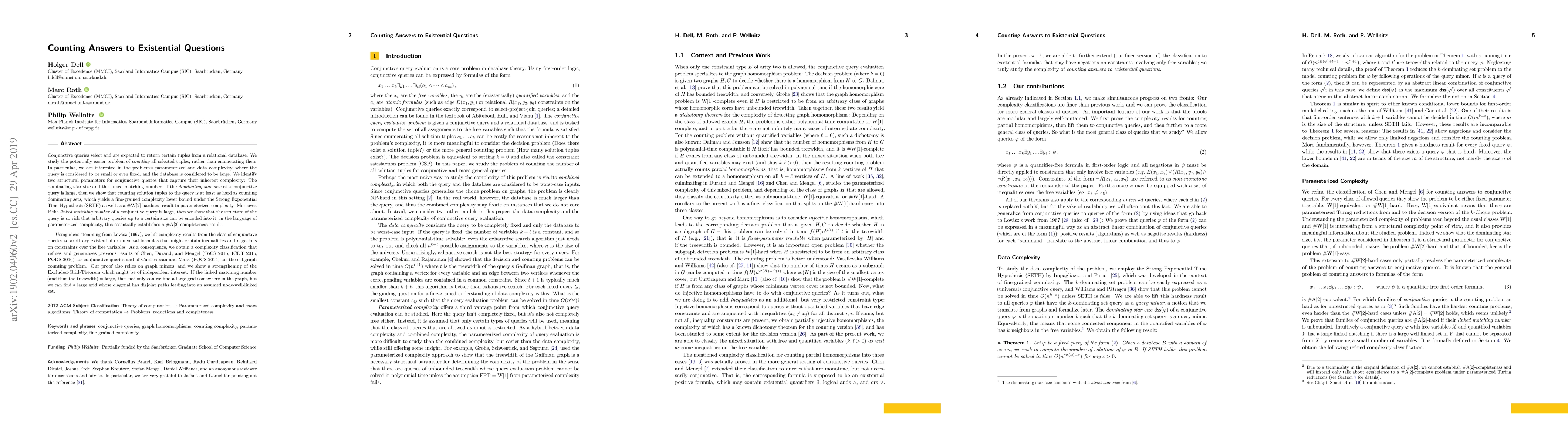 This paper explores the complexity of counting solutions to conjunctive queries in large databases, identifying two structural parameters—dominating star size and linked matching number—that determine query complexity. It establishes lower bounds and completeness results under the Strong Exponential Time Hypothesis, and generalizes these findings to existential or universal formulas with inequalities and negations.