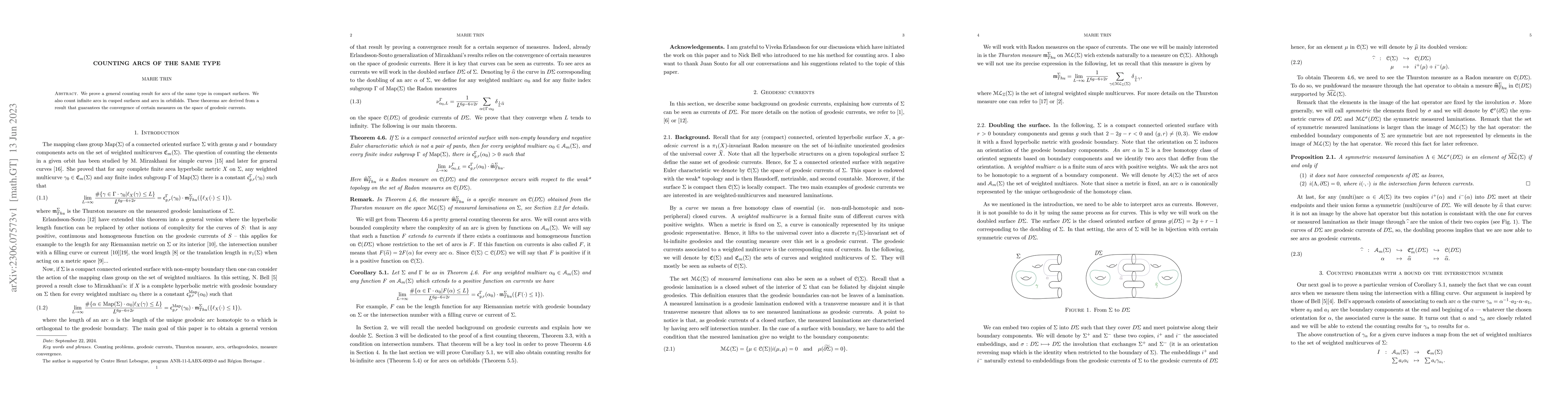 This paper establishes a general counting theorem for arcs of the same type on compact surfaces, extends the count to infinite arcs in cusped surfaces, and applies the results to orbifolds. The theorems are supported by the convergence of specific measures on the space of geodesic currents.