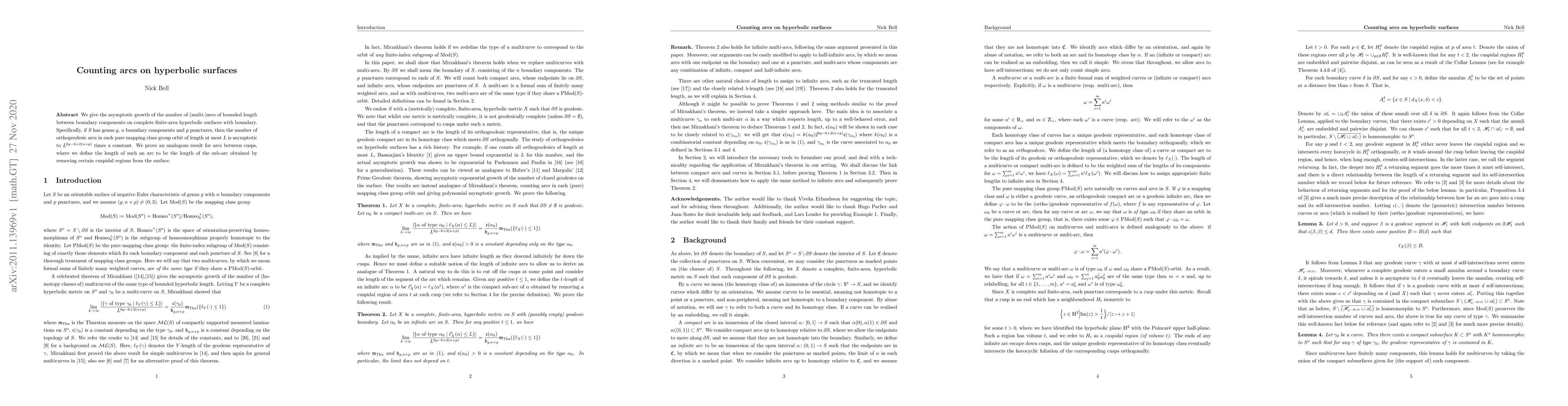 We give the asymptotic growth of the number of (multi-)arcs of bounded length between boundary components on complete finite-area hyperbolic surfaces with boundary. Specifically, if $S$ has genus $g$, $n$ boundary components and $p$ punctures, then the number of orthogeodesic arcs in each pure mapping class group orbit of length at most $L$ is asymptotic to $L^{6g-6+2(n+p)}$ times a constant. We prove an analogous result for arcs between cusps, where we define the length of such an arc to be the length of the sub-arc obtained by removing certain cuspidal regions from the surface.