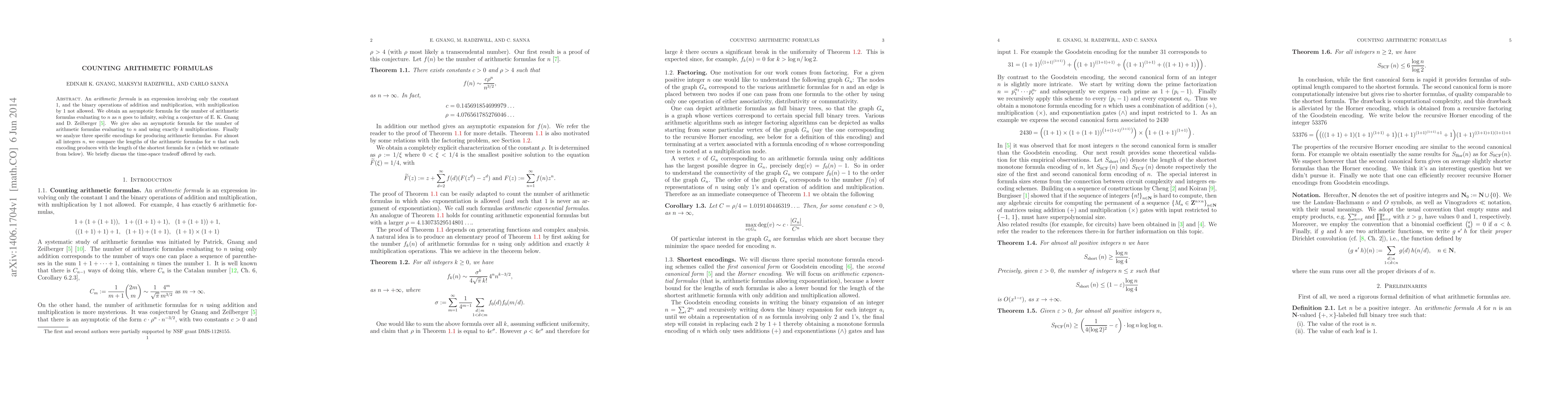 An arithmetic formula is an expression involving only the constant $1$, and the binary operations of addition and multiplication, with multiplication by $1$ not allowed. We obtain an asymptotic formula for the number of arithmetic formulas evaluating to $n$ as $n$ goes to infinity, solving a conjecture of E. K. Gnang and D. Zeilberger. We give also an asymptotic formula for the number of arithmetic formulas evaluating to $n$ and using exactly $k$ multiplications. Finally we analyze three specific encodings for producing arithmetic formulas. For almost all integers $n$, we compare the lengths of the arithmetic formulas for $n$ that each encoding produces with the length of the shortest formula for $n$ (which we estimate from below). We briefly discuss the time-space tradeoff offered by each.