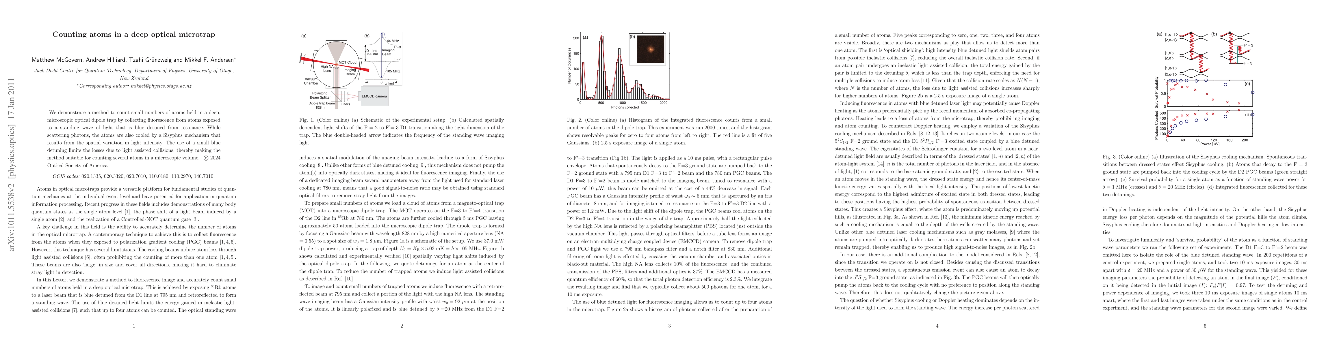 We demonstrate a method to count small numbers of atoms held in a deep, microscopic optical dipole trap by collecting fluorescence from atoms exposed to a standing wave of light that is blue detuned from resonance. While scattering photons, the atoms are also cooled by a Sisyphus mechanism that results from the spatial variation in light intensity. The use of a small blue detuning limits the losses due to light assisted collisions, thereby making the method suitable for counting several atoms in a microscopic volume.