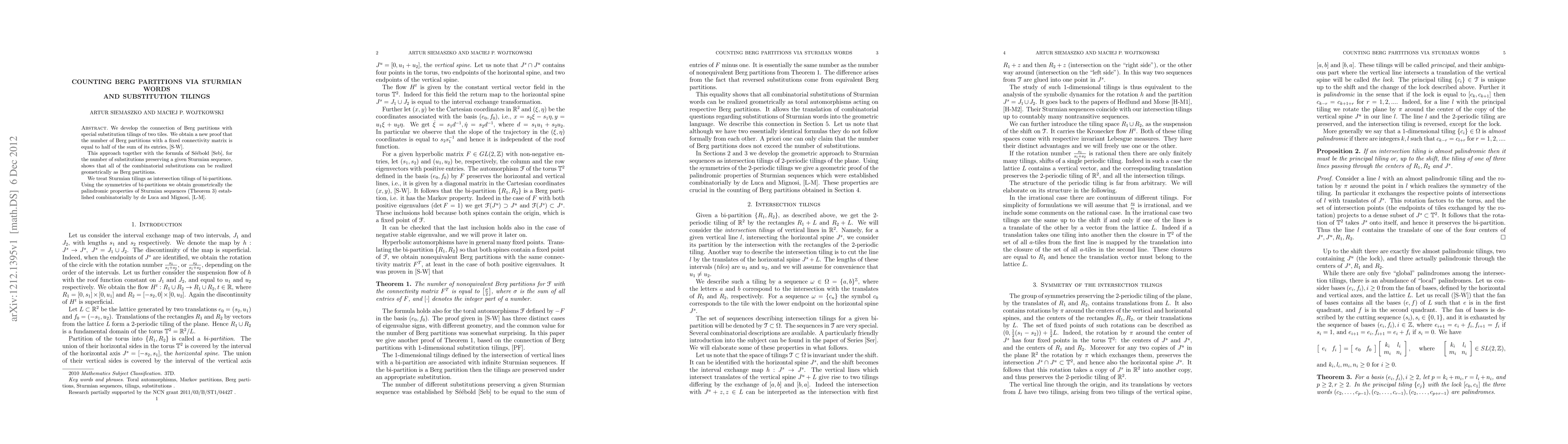 This paper explores the relationship between Berg partitions and specific substitution tilings, proving that the number of Berg partitions corresponds to half the sum of a fixed connectivity matrix. It also demonstrates how combinatorial substitutions can be geometrically represented as Berg partitions, leveraging Sturmian sequences and their palindromic properties.