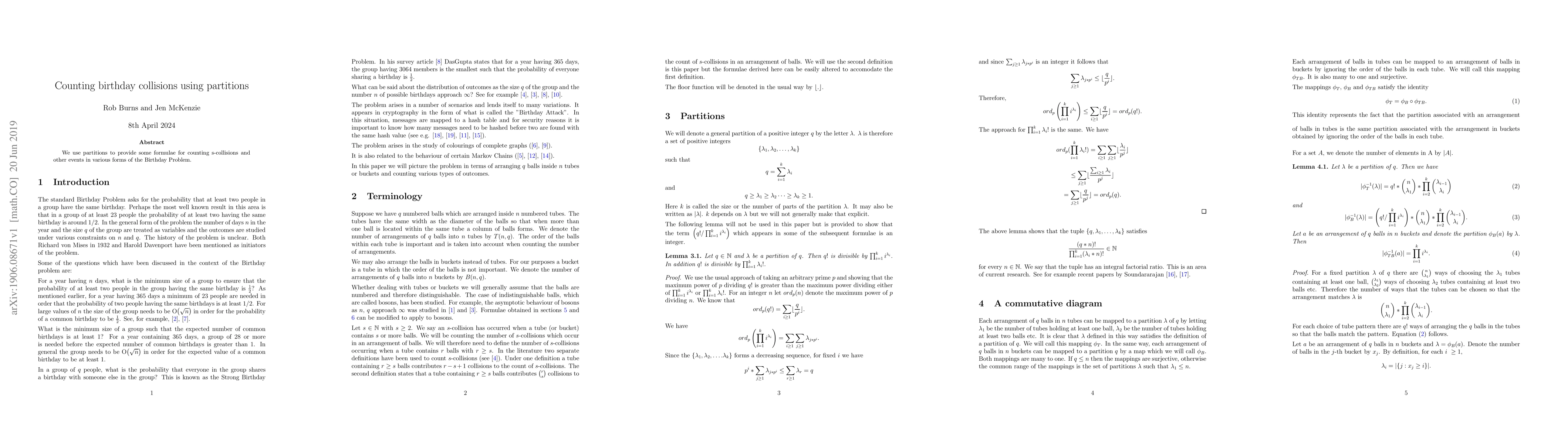 Summary: This paper employs partitions to derive formulas for counting s-collisions and other events in different versions of the Birthday Problem, offering new insights into probabilistic distributions.