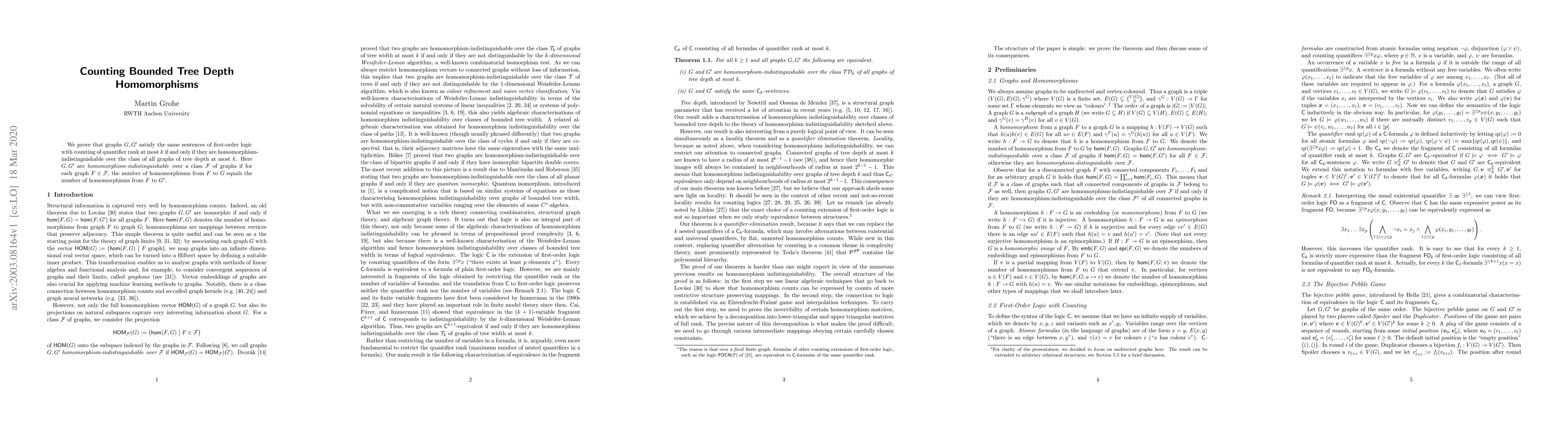This paper establishes that graph isomorphism in first-order logic with counting up to a fixed quantifier rank k corresponds to homomorphism-indistingibility over graphs with tree depth at most k. It concludes that two graphs are indistinguishable if they have equal homomorphism counts from any graph of limited tree depth k.