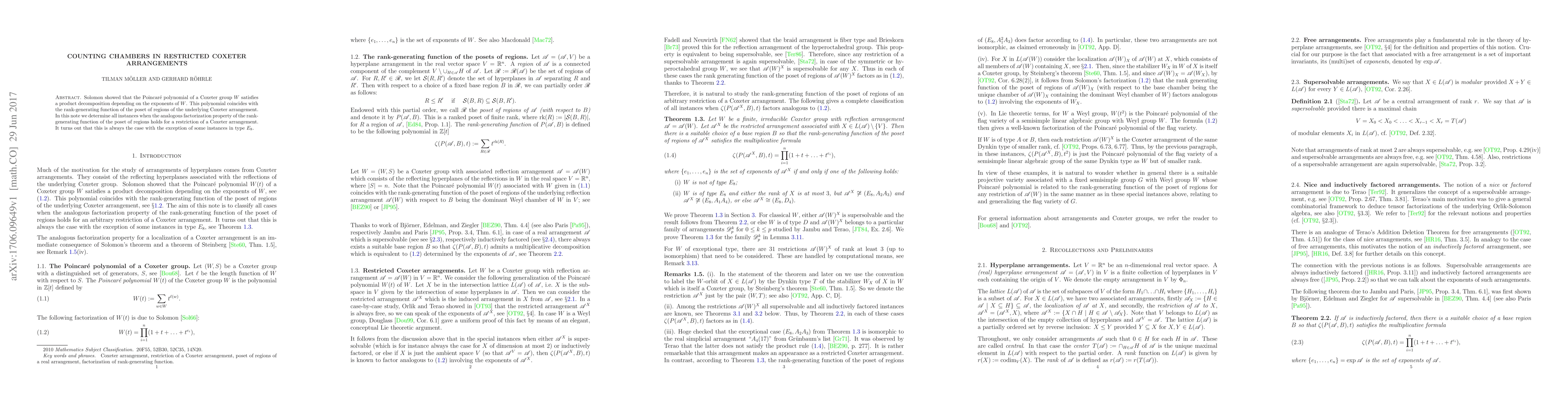 The paper analyzes restricted Coxeter arrangements, focusing on instances where the rank-generating function of the poset of regions has a factorization property analogous to Solomon's product decomposition for Poincaré polynomials of Coxeter groups. It identifies exceptions, primarily in type $E_8$, and uses concepts like supersolvable and inductively factored arrangements.