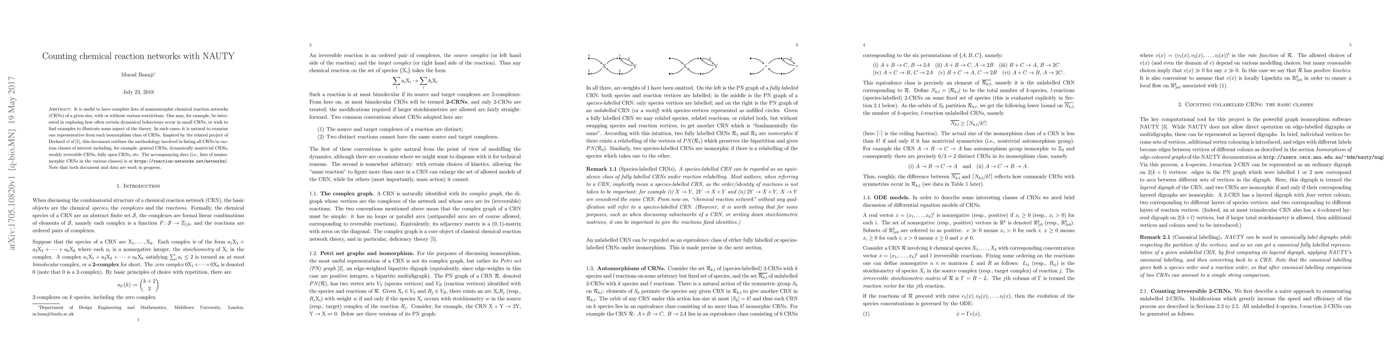 It is useful to have complete lists of nonisomorphic chemical reaction networks (CRNs) of a given size, with or without various restrictions. One may, for example, be interested in exploring how often certain dynamical behaviours occur in small CRNs, or wish to find examples to illustrate some aspect of the theory. In such cases, it is natural to examine one representative from each isomorphism class of CRNs. Inspired by the related project of Deckard et al (Enumeration and online library of mass-action reaction networks. http://arXiv.org/abs/0901.3067, 2009), this document outlines the methodology involved in listing all CRNs in various classes of interest including, for example, general CRNs, dynamically nontrivial CRNs, weakly reversible CRNs, fully open CRNs, etc. The accompanying data (i.e., lists of nonisomorphic CRNs in the various classes) is at https://reaction-networks.net/networks/. Note that both document and data are work in progress.