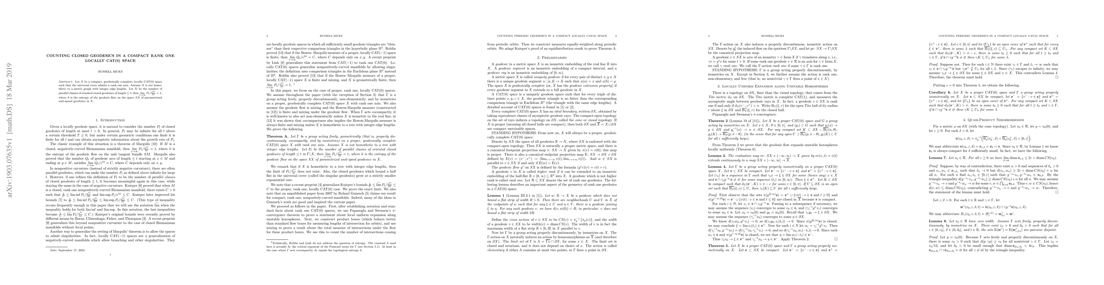Let $X$ be a compact, geodesically complete, locally CAT(0) space such that the universal cover admits a rank one axis. Assume $X$ is not homothetic to a metric graph with integer edge lengths. Let $P_t$ be the number of parallel classes of oriented closed geodesics of length $\le t$; then $\lim\limits_{t \to \infty} P_t / \frac{e^{ht}}{ht} = 1$, where $h$ is the entropy of the geodesic flow on the space $SX$ of parametrized unit-speed geodesics in $X$.