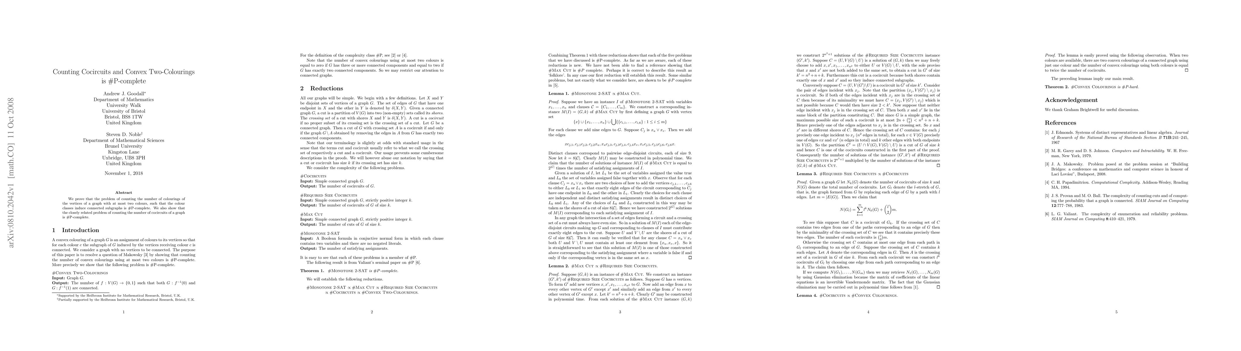 We prove that the problem of counting the number of colourings of the vertices of a graph with at most two colours, such that the colour classes induce connected subgraphs is #P-complete. We also show that the closely related problem of counting the number of cocircuits of a graph is #P-complete.