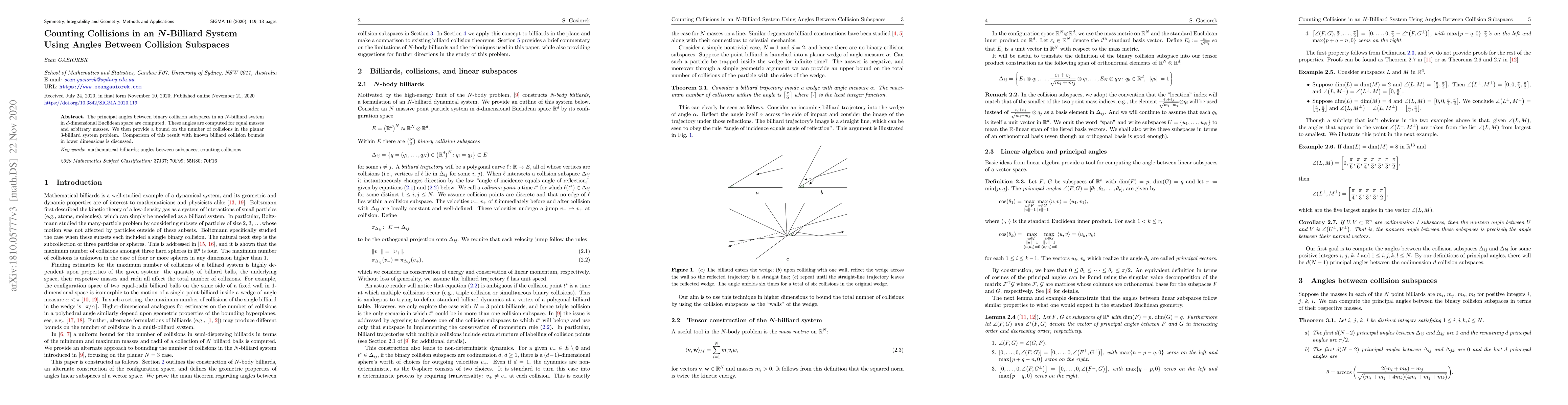 The principal angles between binary collision subspaces in an $N$-billiard system in $d$-dimensional Euclidean space are computed. These angles are computed for equal masses and arbitrary masses. We then provide a bound on the number of collisions in the planar 3-billiard system problem. Comparison of this result with known billiard collision bounds in lower dimensions is discussed.