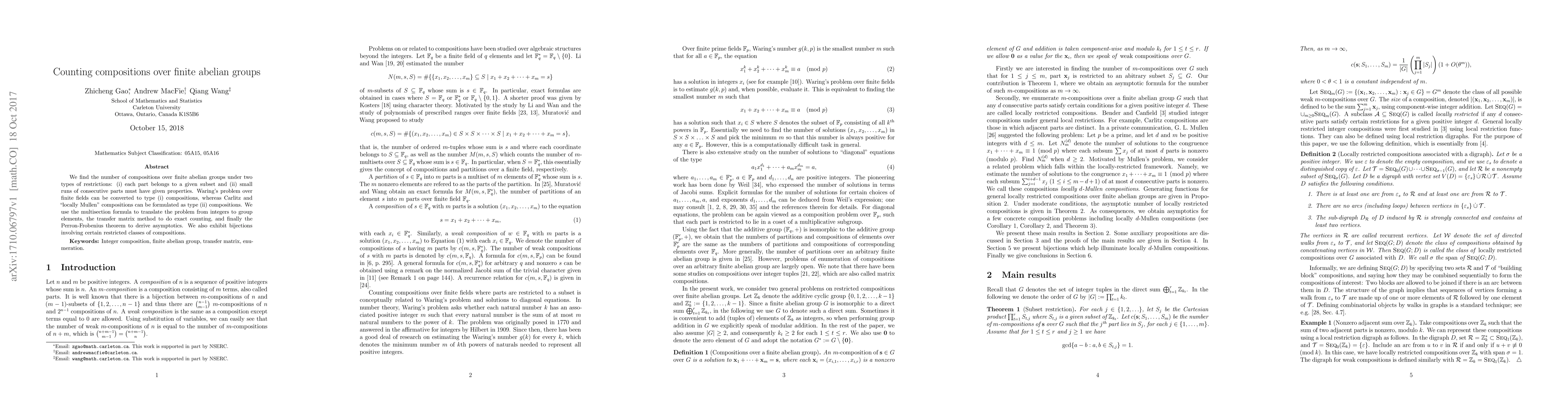 This paper counts compositions over finite abelian groups under specified restrictions, employing the multisection formula, transfer matrix method, and Perron-Frobenius theorem for exact counting and asymptotics, and presents bijections for restricted composition classes. Connections to Waring's problem and Carlitz compositions are highlighted.