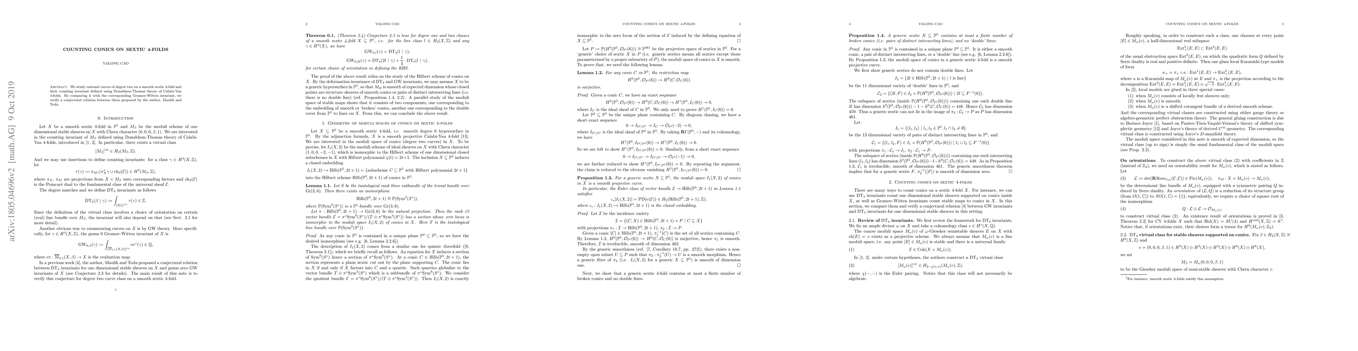 This paper investigates rational curves of degree two on smooth sextic 4-folds, using Donaldson-Thomas theory to define a counting invariant, and confirms a conjectured relation between this invariant and the Gromov-Witten invariant, as proposed by Maulik, Toda, and the author.