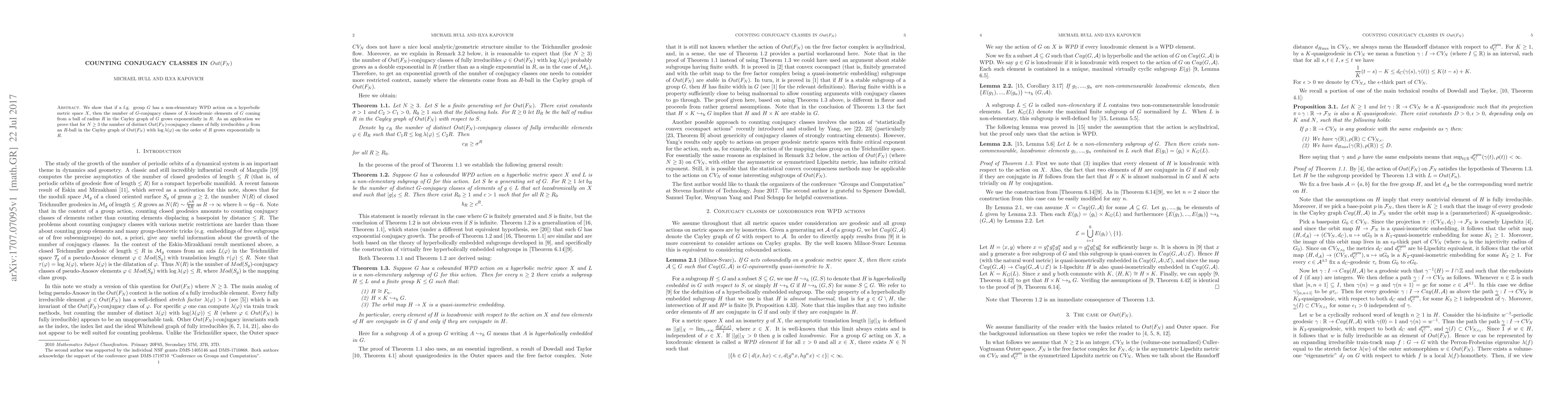 We show that if a f.g. group $G$ has a non-elementary WPD action on a hyperbolic metric space $X$, then the number of $G$-conjugacy classes of $X$-loxodromic elements of $G$ coming from a ball of radius $R$ in the Cayley graph of $G$ grows exponentially in $R$. As an application we prove that for $N\ge 3$ the number of distinct $Out(F_N)$-conjugacy classes of fully irreducibles $\phi$ from an $R$-ball in the Cayley graph of $Out(F_N)$ with $\log\lambda(\phi)$ on the order of $R$ grows exponentially in $R$.