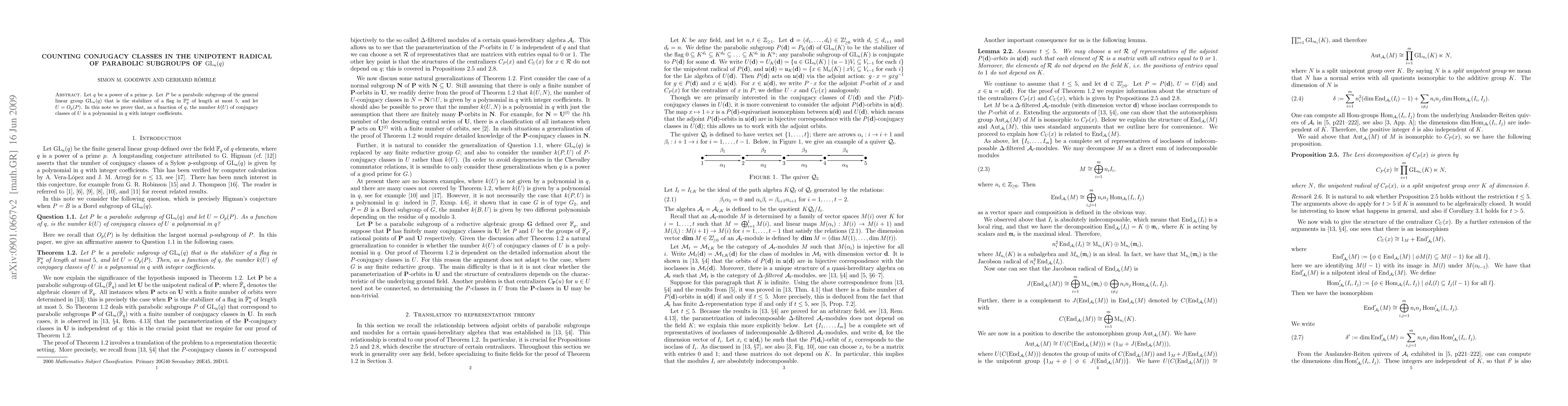 This paper proves that the number of conjugacy classes in the unipotent radical $U$ of parabolic subgroups $P$ of $\GL_n(q)$, which stabilize flags of length at most 5, is a polynomial in $q$ with integer coefficients. The result holds for $q$ as a power of a prime $p$.