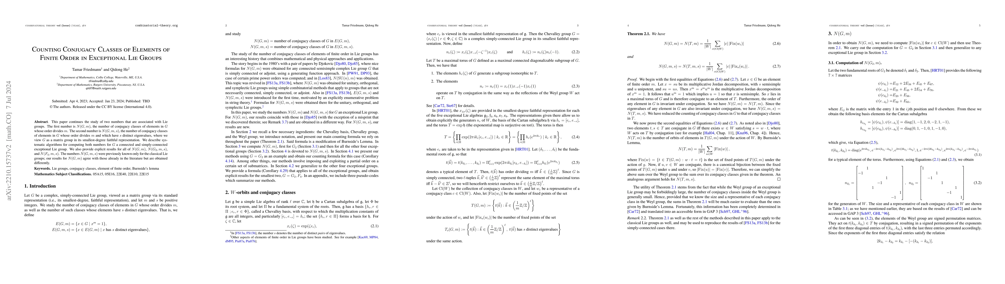 This paper completes the study of two numbers that are associated with Lie groups. The first number is $N(G,m)$, the number of conjugacy classes of elements in $G$ whose order divides $m$. The second number is $N(G,m,s)$, the number of conjugacy classes of elements in $G$ whose order divides $m$ and which have $s$ distinct eigenvalues, where we view $G$ as a matrix group in its smallest-degree faithful representation. We describe systematic algorithms for computing both numbers for any connected and simply-connected exceptional Lie group. We also provide explicit results for all of $N(G,m)$, $N(G_2,m,s)$, and $N(F_4,m,s)$. The numbers $N(G,m,s)$ were previously known only for the classical Lie groups; our results for $N(G,m)$ agree with those already in the literature but are obtained differently.