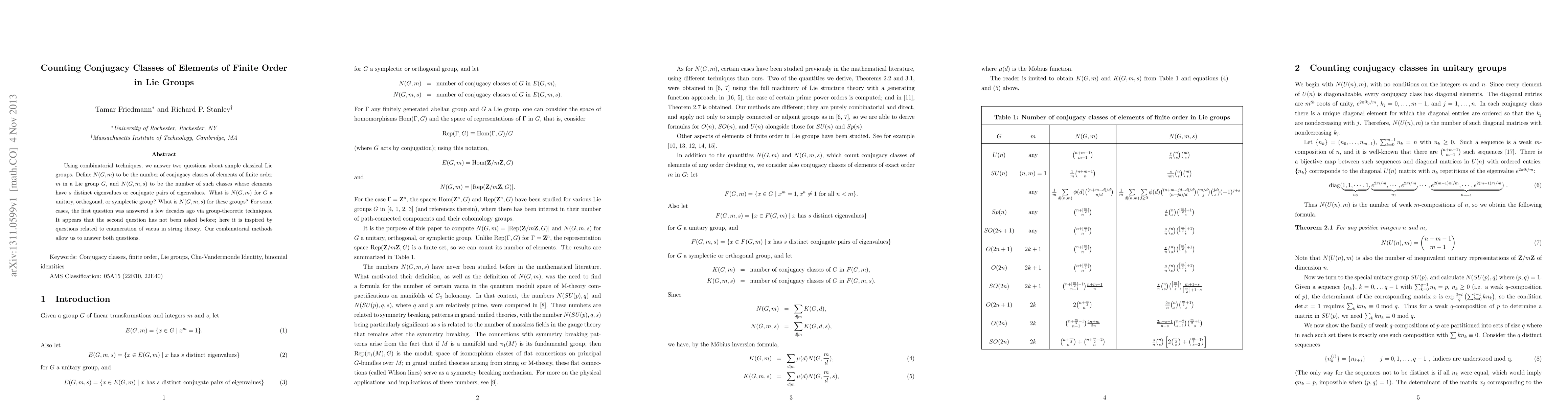 This paper uses combinatorial techniques to determine the number of conjugacy classes of elements of finite order in simple classical Lie groups (unitary, orthogonal, and symplectic) and also explores the subset of these classes where elements have specific distinct eigenvalues or conjugate pairs of eigenvalues. It answers two long-standing questions regarding these classes and introduces a new question inspired by string theory enumeration.