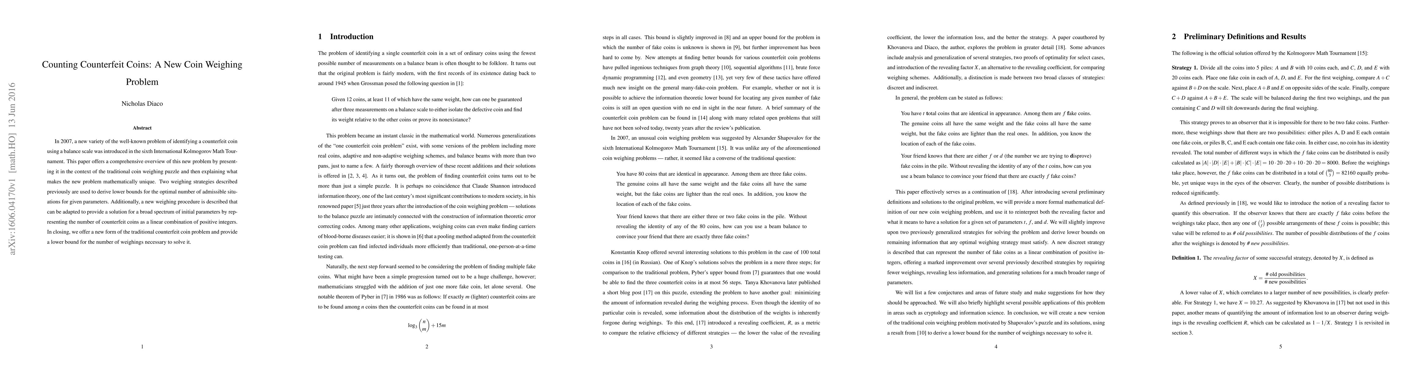 In 2007, a new variety of the well-known problem of identifying a counterfeit coin using a balance scale was introduced in the sixth International Kolmogorov Math Tournament. This paper offers a comprehensive overview of this new problem by presenting it in the context of the traditional coin weighing puzzle and then explaining what makes the new problem mathematically unique. Two weighing strategies described previously are used to derive lower bounds for the optimal number of admissible situations for given parameters. Additionally, a new weighing procedure is described that can be adapted to provide a solution for a broad spectrum of initial parameters by representing the number of counterfeit coins as a linear combination of positive integers. In closing, we offer a new form of the traditional counterfeit coin problem and provide a lower bound for the number of weighings necessary to solve it.