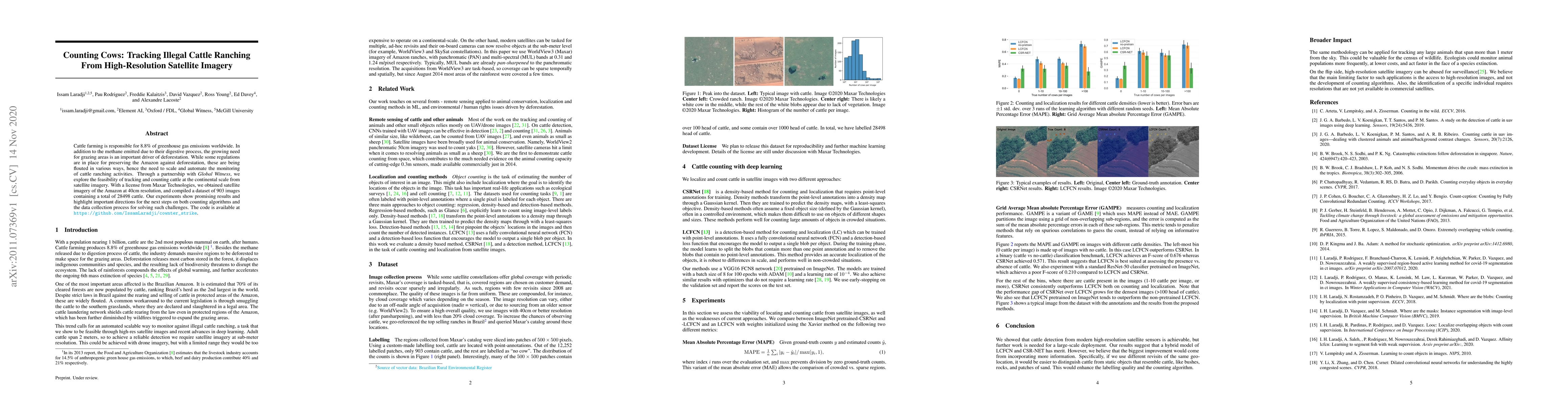 This paper investigates the use of high-resolution satellite imagery to monitor illegal cattle ranching in the Amazon, aiming to combat deforestation and greenhouse gas emissions. The authors developed a dataset and algorithms to count cattle from 903 images, demonstrating promising results and suggesting future improvements.