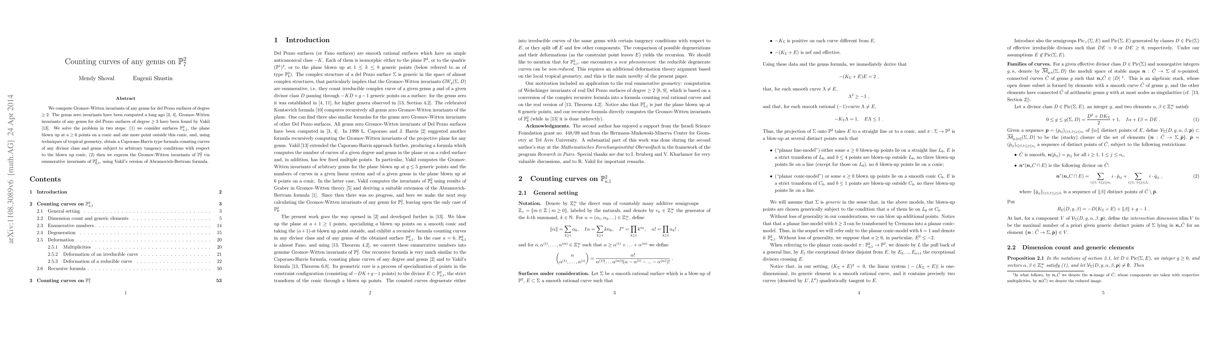 We compute Gromov-Witten invariants of any genus for del Pezzo surfaces of degree $\ge2$. The genus zero invariants have been computed a long ago, Gromov-Witten invariants of any genus for del Pezzo surfaces of degree $\ge3$ have been found by Vakil. We solve the problem in two steps: (1) we consider the plane blown up at 6 points on a conic and one more point outside this conic (weak Fano surface), and, using techniques of tropical geometry, obtain a Caporaso-Harris type formula counting curves of any divisor class and genus subject to arbitrary tangency conditions with respect to the blown up conic, (2) then we express the Gromov-Witten invariants of the plane blown up at 7 points via enumerative invariants of the weak Fano surface, using Vakil's version of Abramovich-Bertram formula.