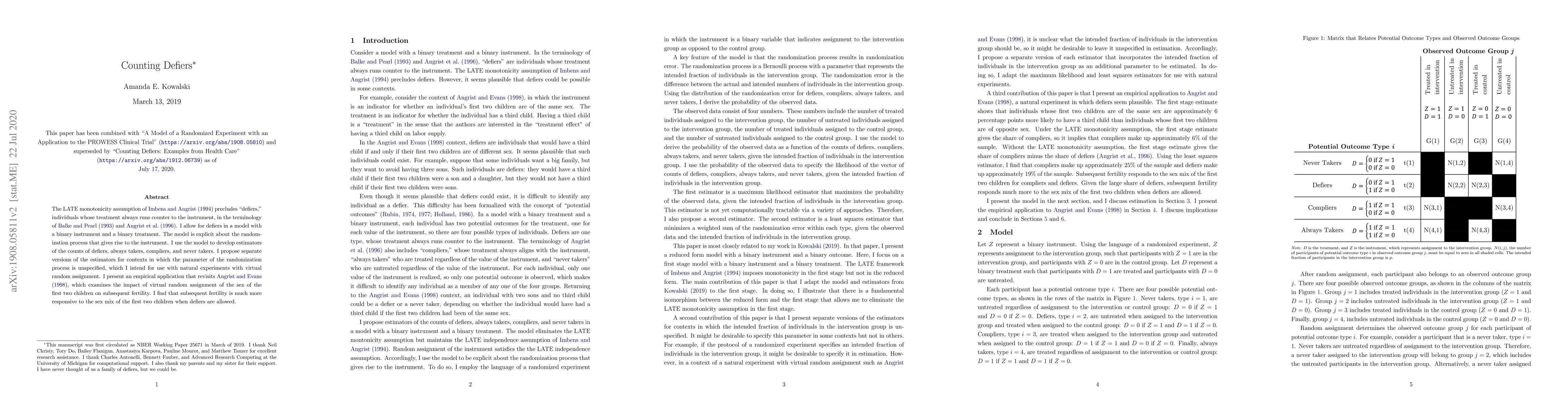 The LATE monotonicity assumption of Imbens and Angrist (1994) precludes "defiers," individuals whose treatment always runs counter to the instrument, in the terminology of Balke and Pearl (1993) and Angrist et al. (1996). I allow for defiers in a model with a binary instrument and a binary treatment. The model is explicit about the randomization process that gives rise to the instrument. I use the model to develop estimators of the counts of defiers, always takers, compliers, and never takers. I propose separate versions of the estimators for contexts in which the parameter of the randomization process is unspecified, which I intend for use with natural experiments with virtual random assignment. I present an empirical application that revisits Angrist and Evans (1998), which examines the impact of virtual random assignment of the sex of the first two children on subsequent fertility. I find that subsequent fertility is much more responsive to the sex mix of the first two children when defiers are allowed.