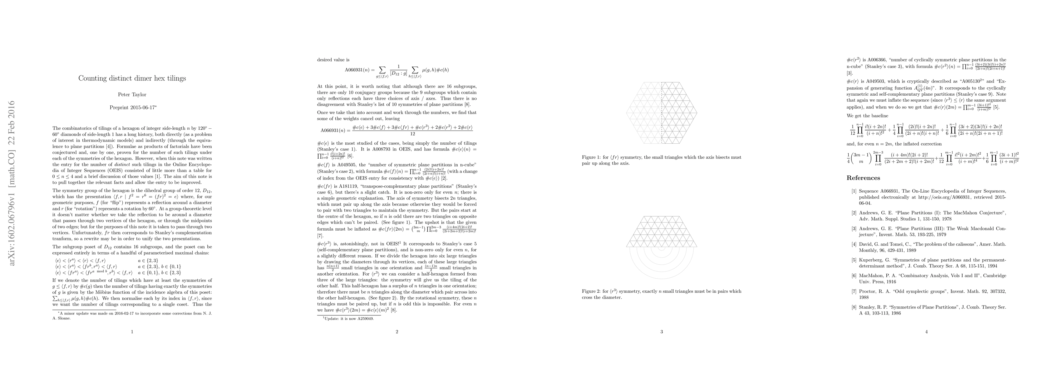 The combinatorics of tilings of a hexagon of integer side-length $n$ by 120 degree - 60 degree diamonds of side-length 1 has a long history, both directly (as a problem of interest in thermodynamic models) and indirectly (through the equivalence to plane partitions). Formulae as products of factorials have been conjectured and, one by one, proven for the number of such tilings under each of the symmetries of the hexagon. However, when this note was written the entry for the number of distinct such tilings in the Online Encyclopedia of Integer Sequences (OEIS) consisted of little more than a table for $0 \le n \le 4$ and a brief discussion of those values. The aim of this note is to pull together the relevant facts.
