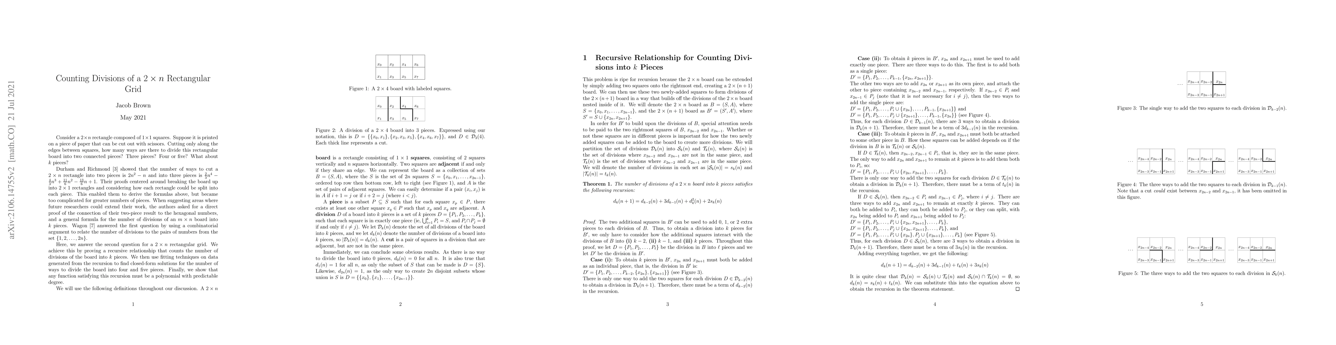 The paper establishes a recursive relationship to count the number of ways to divide a $2 imes n$ rectangular grid into $k$ pieces, then uses fitting techniques to derive closed-form polynomial solutions for $k=4$ and $k=5$ based on data generated from the recursion.