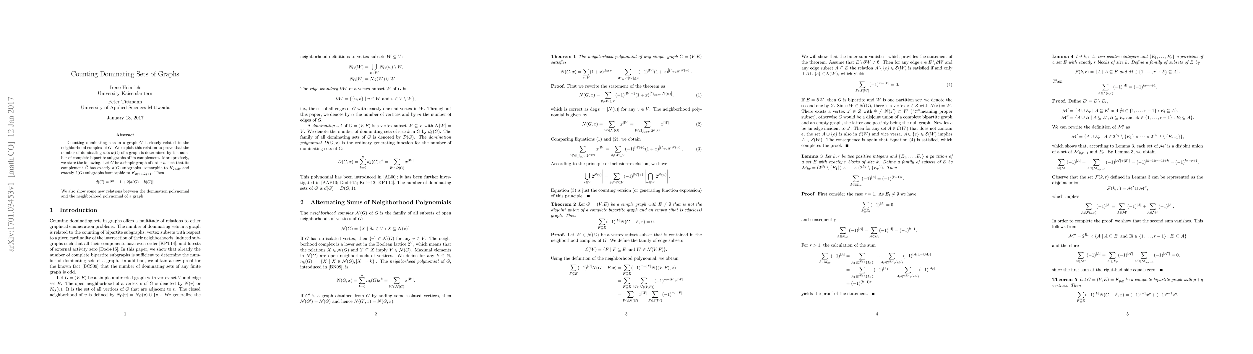 This paper establishes a relationship between the number of dominating sets in a graph $G$ and the number of specific complete bipartite subgraphs in its complement. It proposes that $d(G) = 2^n -1 + 2[a(G)-b(G)]$, where $a(G)$ and $b(G)$ count particular subgraphs in the complement, and explores connections between the domination polynomial and the neighborhood polynomial.