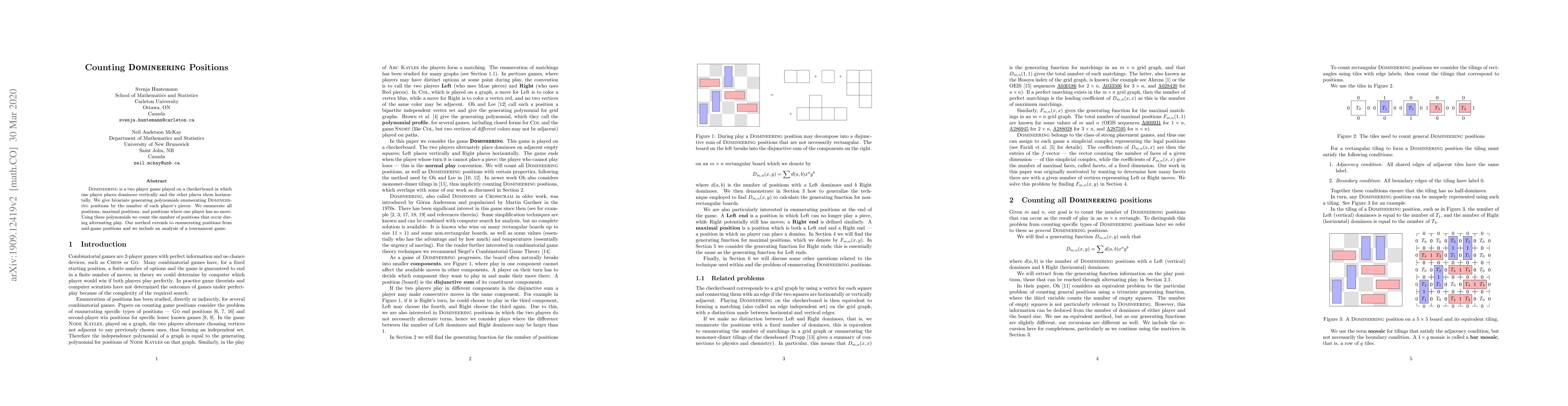 This paper enumerates Domineering game positions using bivariate generating polynomials, counting all positions, maximal positions, and those where one player has no move. The method extends to mid-game positions and includes an analysis of tournament games.