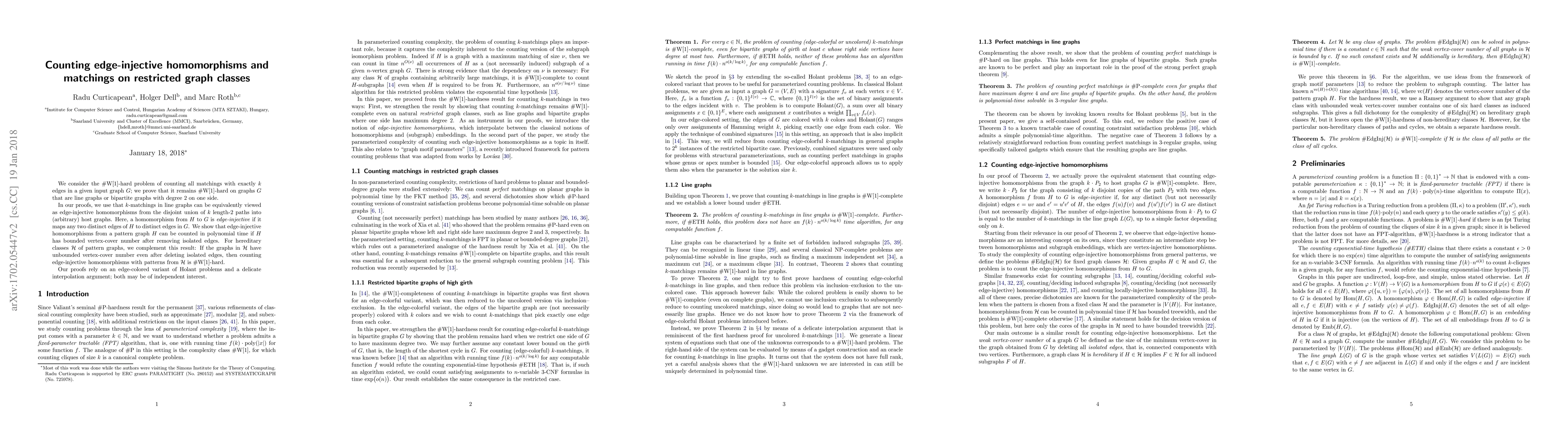 This paper investigates the computational complexity of counting $k$-matchings in restricted graph classes, proving $\#\mathsf{W}[1]$-hardness for line graphs and degree-$2$ bipartite graphs. It also explores edge-injective homomorphisms, showing polynomial-time counting for pattern graphs with bounded vertex-cover number after removing isolated edges.