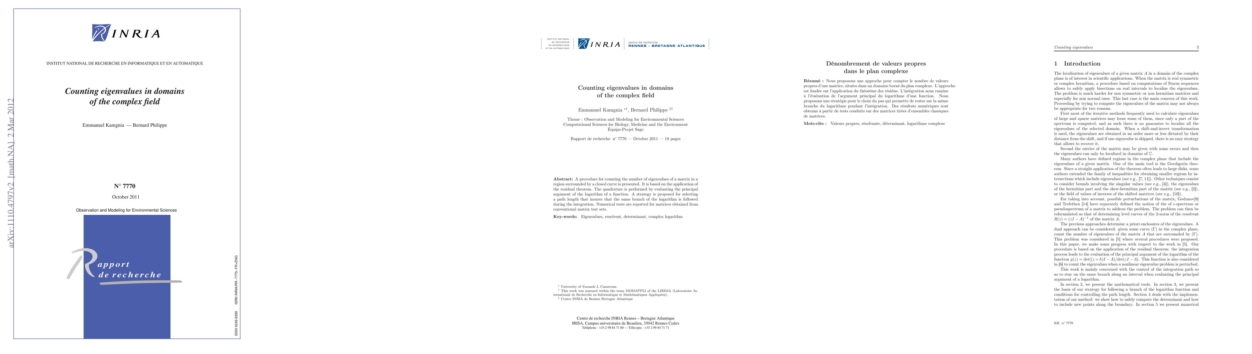 A procedure for counting the number of eigenvalues of a matrix in a region surrounded by a closed curve is presented. It is based on the application of the residual theorem. The quadrature is performed by evaluating the principal argument of the logarithm of a function. A strategy is proposed for selecting a path length that insures that the same branch of the logarithm is followed during the integration. Numerical tests are reported for matrices obtained from conventional matrix test sets.