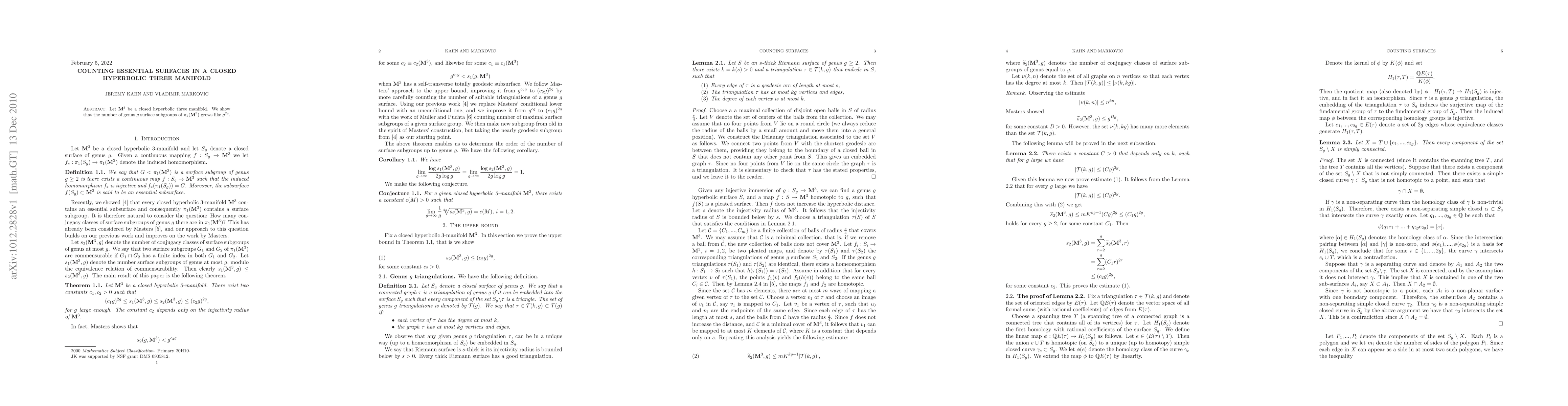 Summary: This paper demonstrates that the number of genus g surface subgroups in the fundamental group of a closed hyperbolic 3-manifold M scales as g^2g, providing insight into the structure of these subgroups.