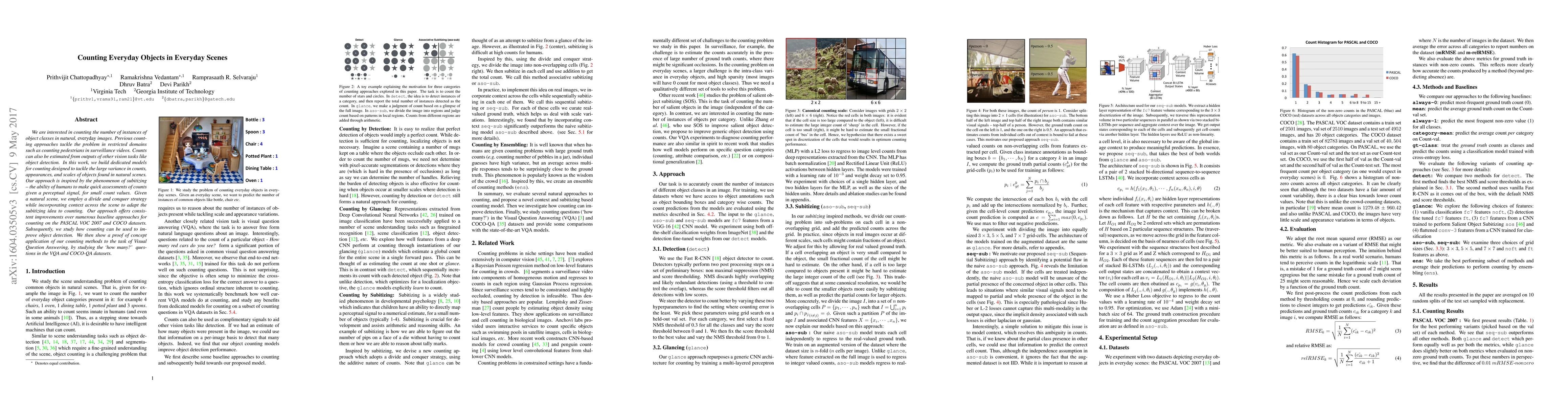 We are interested in counting the number of instances of object classes in natural, everyday images. Previous counting approaches tackle the problem in restricted domains such as counting pedestrians in surveillance videos. Counts can also be estimated from outputs of other vision tasks like object detection. In this work, we build dedicated models for counting designed to tackle the large variance in counts, appearances, and scales of objects found in natural scenes. Our approach is inspired by the phenomenon of subitizing - the ability of humans to make quick assessments of counts given a perceptual signal, for small count values. Given a natural scene, we employ a divide and conquer strategy while incorporating context across the scene to adapt the subitizing idea to counting. Our approach offers consistent improvements over numerous baseline approaches for counting on the PASCAL VOC 2007 and COCO datasets. Subsequently, we study how counting can be used to improve object detection. We then show a proof of concept application of our counting methods to the task of Visual Question Answering, by studying the `how many?' questions in the VQA and COCO-QA datasets.