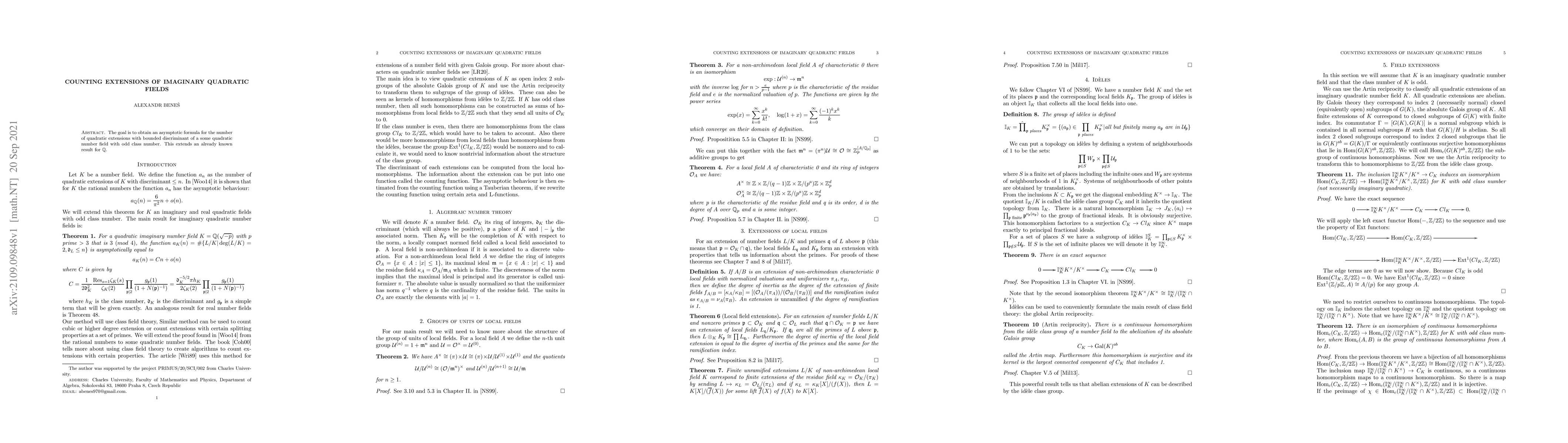 Summary: The paper aims to derive an asymptotic formula for the number of quadratic extensions of a specified imaginary quadratic field with bounded discriminant, extending previous results established for the rational field Q. The focus is on fields with odd class number.
