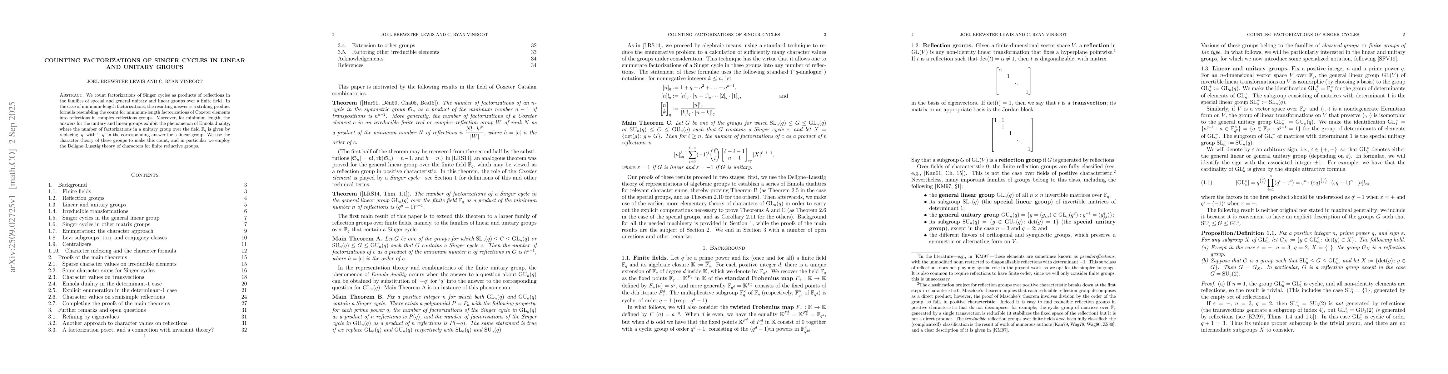 We count factorizations of Singer cycles as products of reflections in the families of special and general unitary and linear groups over a finite field. In the case of minimum-length factorizations, the resulting answer is a striking product formula resembling the count for minimum-length factorizations of Coxeter elements into reflections in complex reflections groups. Moreover, for minimum length, the answers for the unitary and linear groups exhibit the phenomenon of Ennola duality, where the number of factorizations in a unitary group over the field $\mathbb{F}_q$ is given by replacing `$q$' with `$-q$' in the corresponding answer for a linear group. We use the character theory of these groups to make this count, and in particular we employ the Deligne--Lusztig theory of characters for finite reductive groups.
