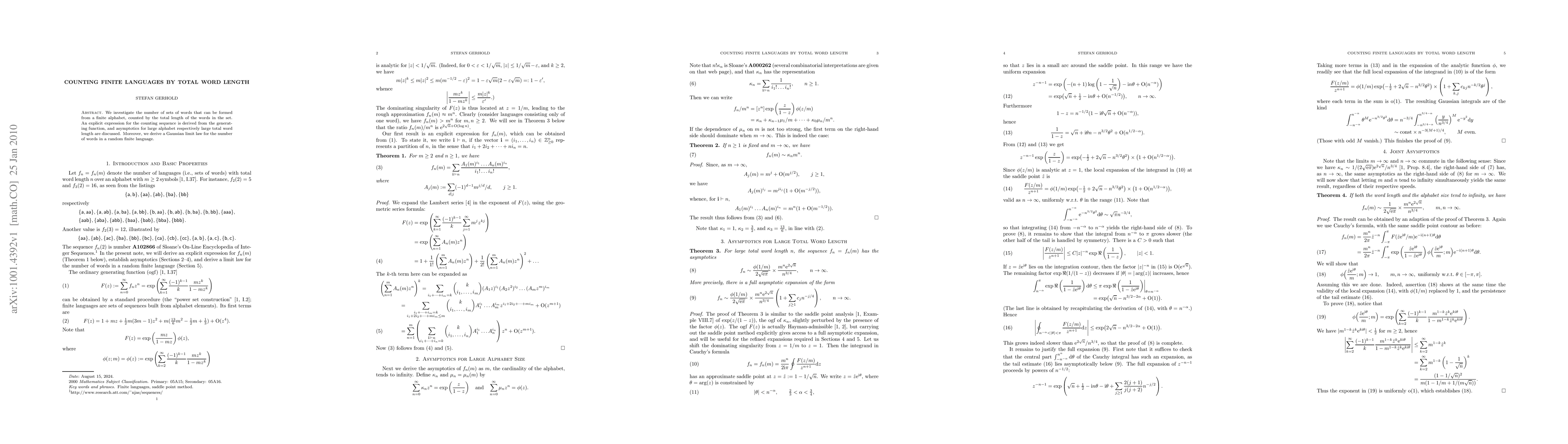 Researchers investigate how many different sets of words can be created from a finite alphabet based on word length, finding an explicit expression for the counting sequence and a Gaussian limit law for random languages.