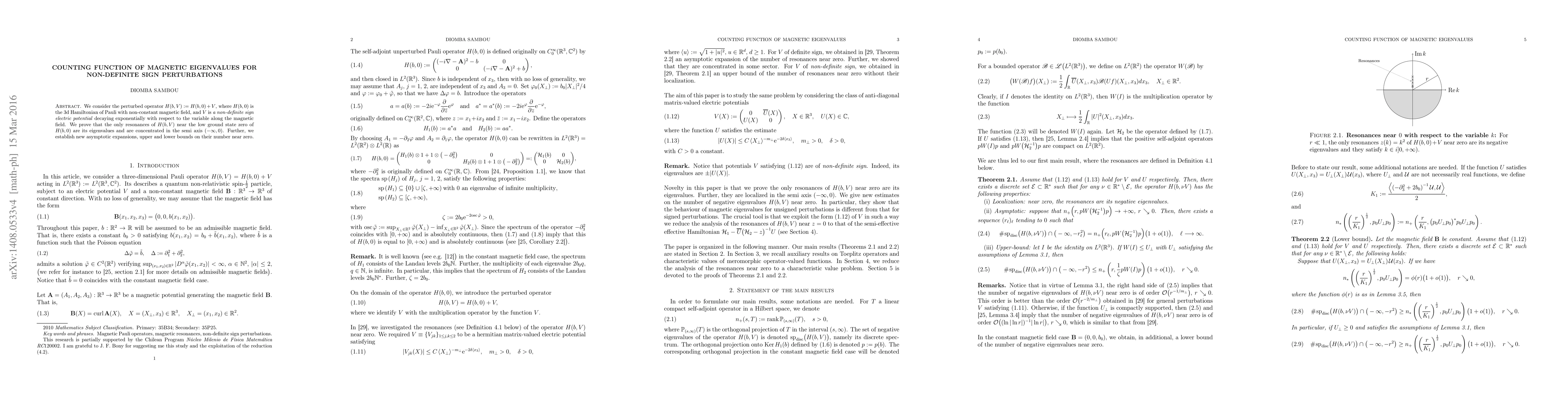 This research paper explores how a non-definite sign electric potential affects the resonances of a magnetic field in 3D Hamiltonian calculations, finding that only eigenvalues of the operator are relevant near zero energy and their number is bounded by asymptotic expansions.