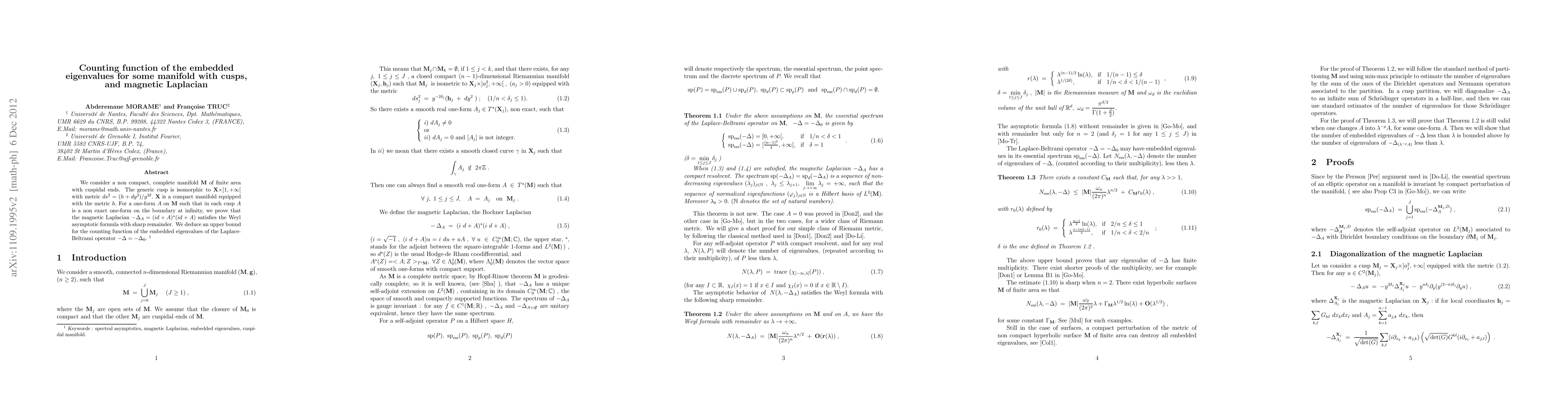 We consider a non compact, complete manifold {\bf{M}} of finite area with cuspidal ends. The generic cusp is isomorphic to ${\bf{X}}\times ]1,+\infty [$ with metric $ds^2=(h+dy^2)/y^{2\delta}.$ {\bf{X}} is a compact manifold with nonzero first Betti number equipped with the metric $h.$ For a one-form $A$ on {\bf{M}} such that in each cusp $A$ is a non exact one-form on the boundary at infinity, we prove that the magnetic Laplacian $-\Delta_A=(id+A)^\star (id+A)$ satisfies the Weyl asymptotic formula with sharp remainder. We deduce an upper bound for the counting function of the embedded eigenvalues of the Laplace-Beltrami operator $-\Delta =-\Delta_0.$
